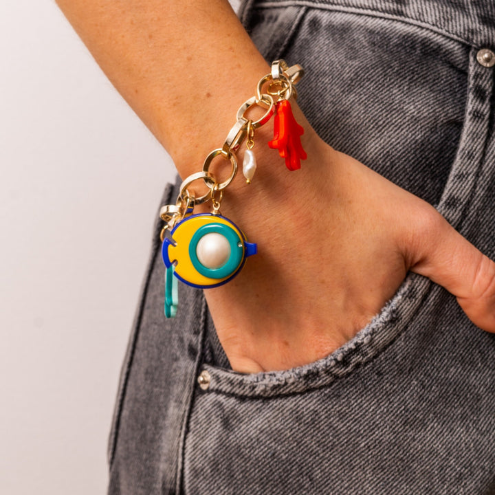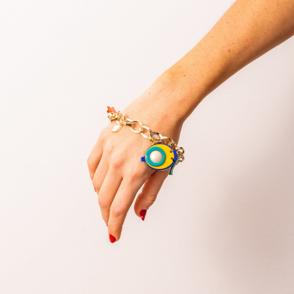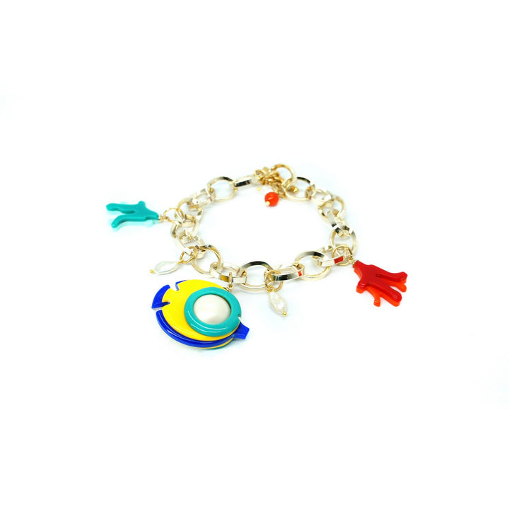 This charm bracelet is made of acrylic and has a chain and 'T' clasp closure. It features a fish pendant with a shell pearl application, a natural stone bead, and freshwater pearls. The metals have a golden finish.