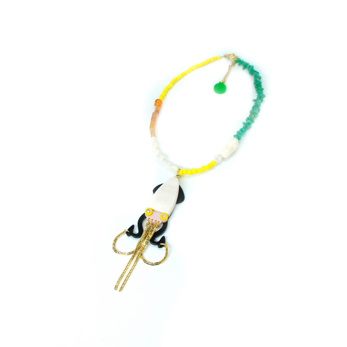 Handcrafted from acrylic with a golden finish, this short necklace features a pendant, glass rhinestones, a metallic chain fringe, glass beads, natural stone beads, and a freshwater baroque pearl.