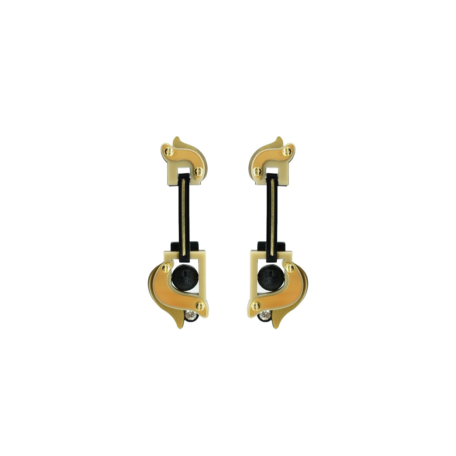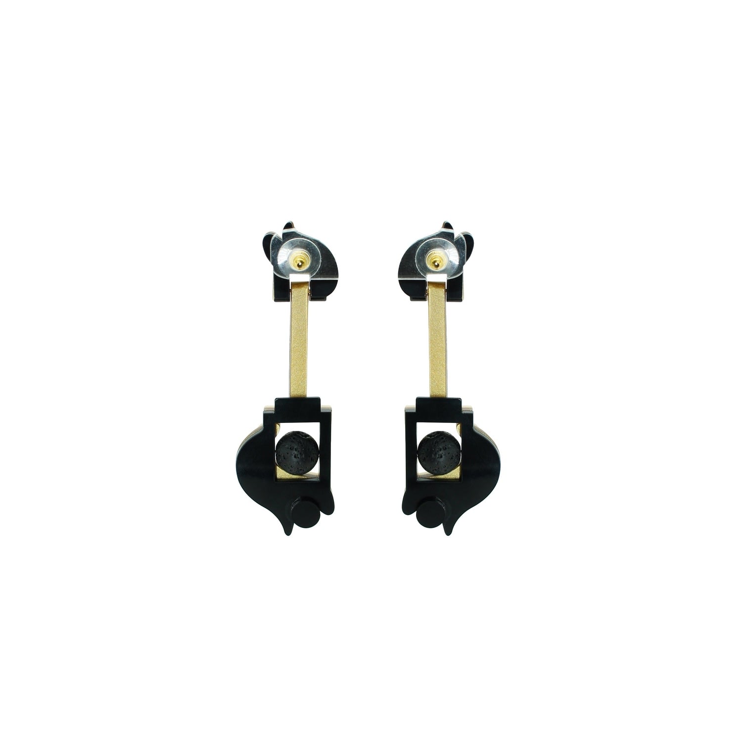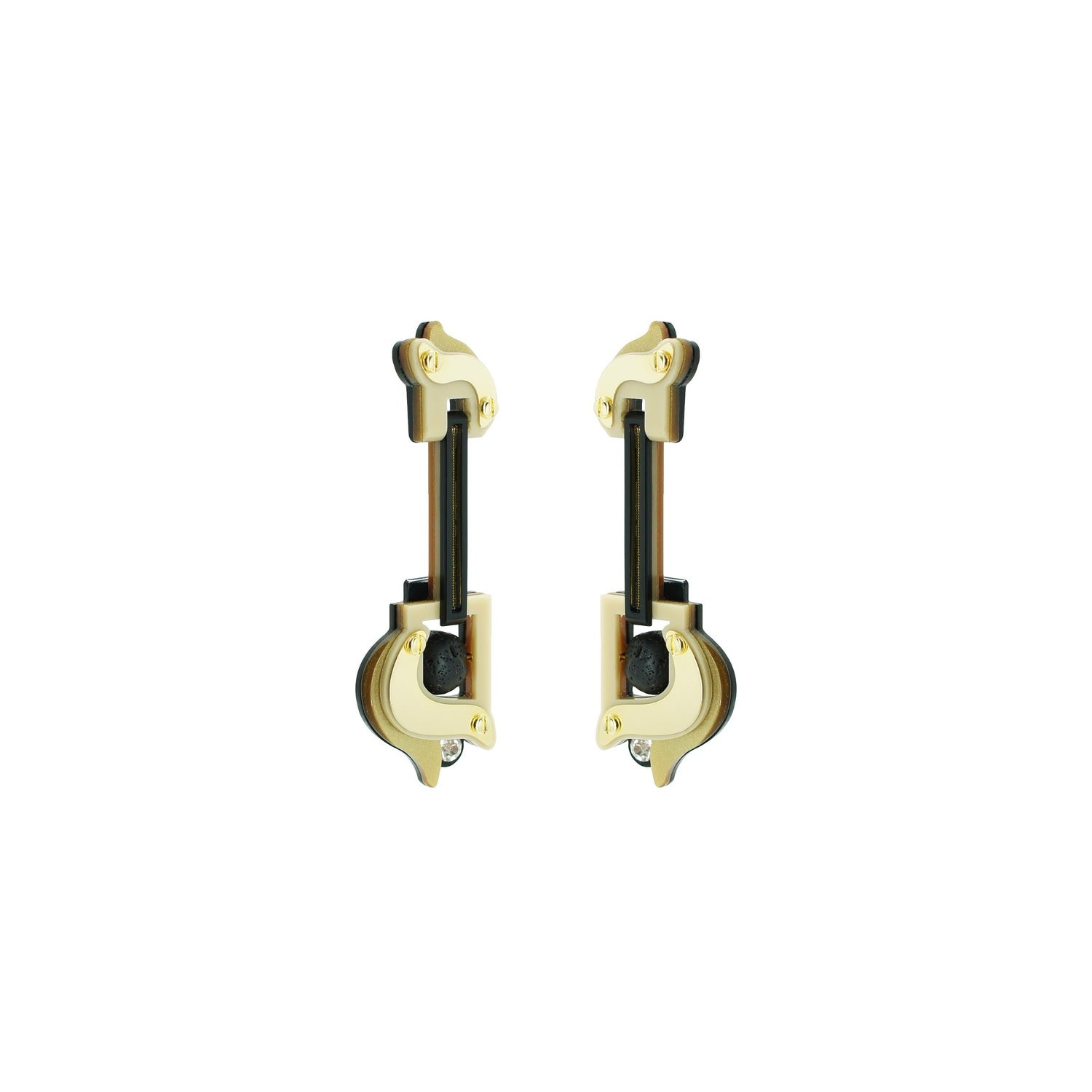 These dangle earrings are made from acrylic, brass with a golden finish, and volcanic lava beads. They are handmade by Brazilian artisans.