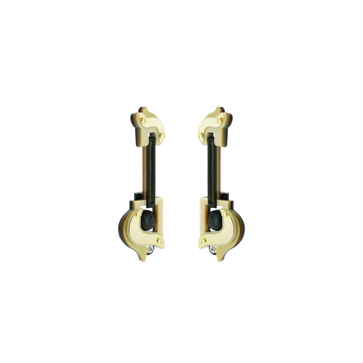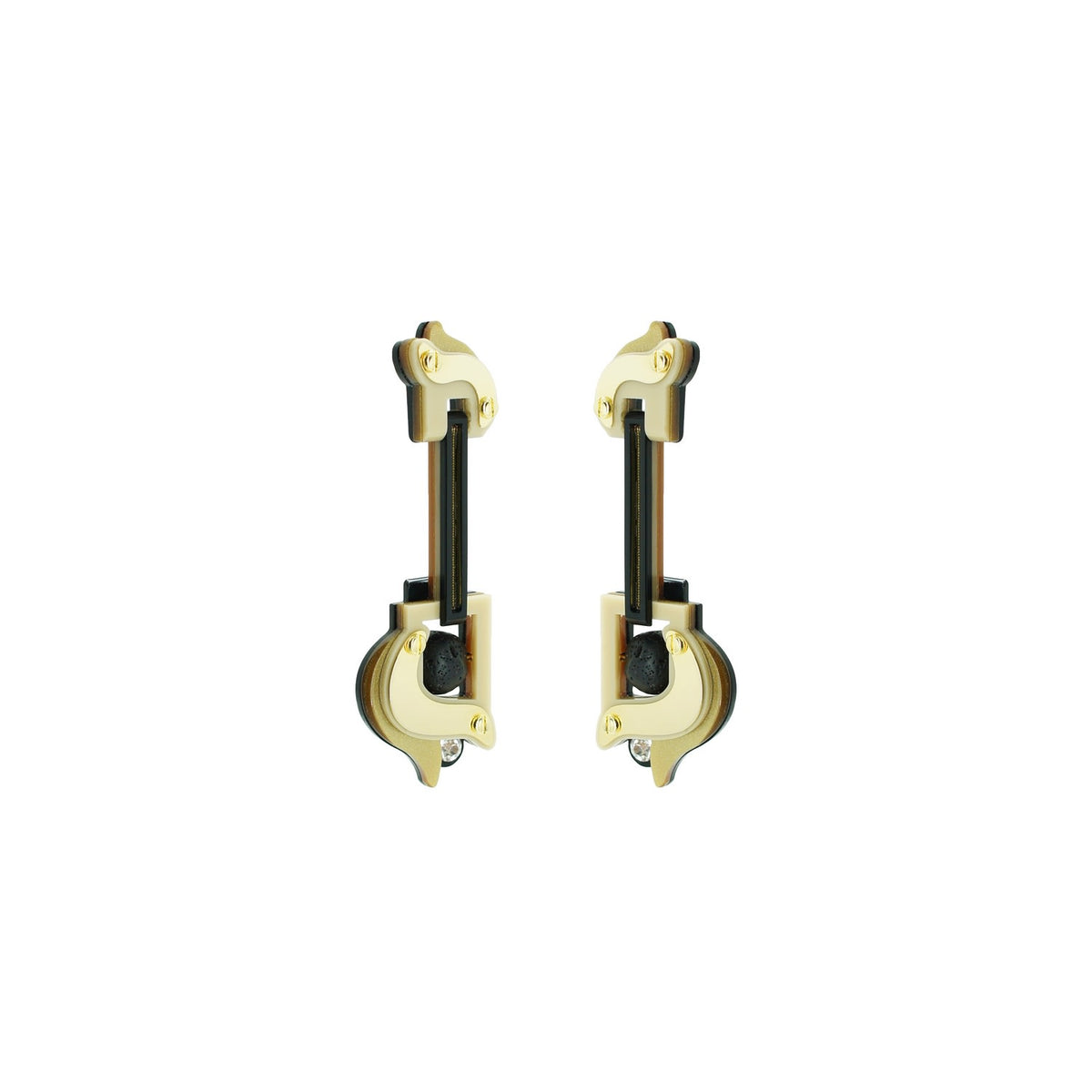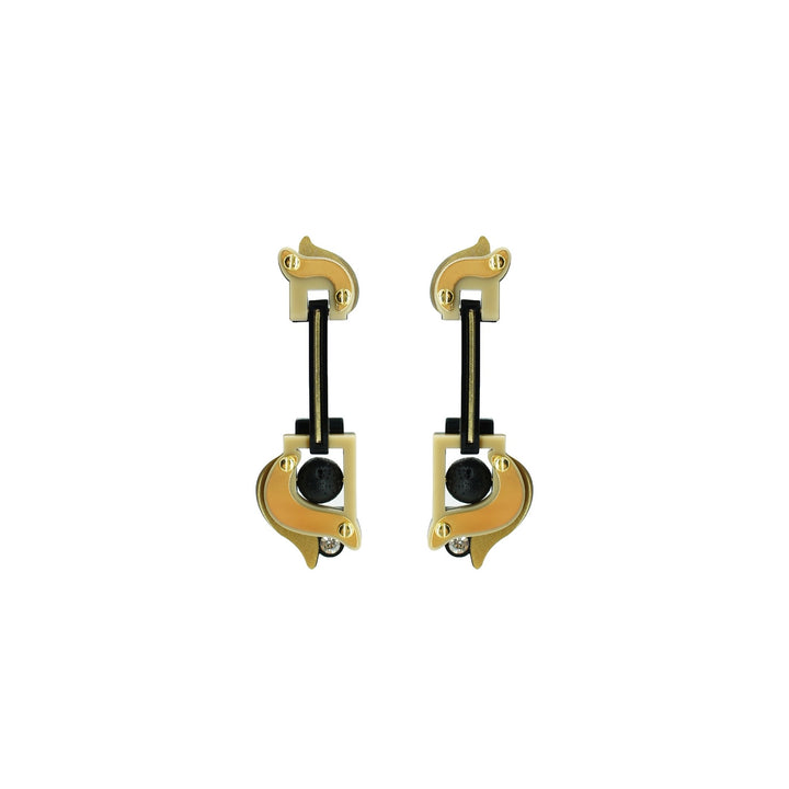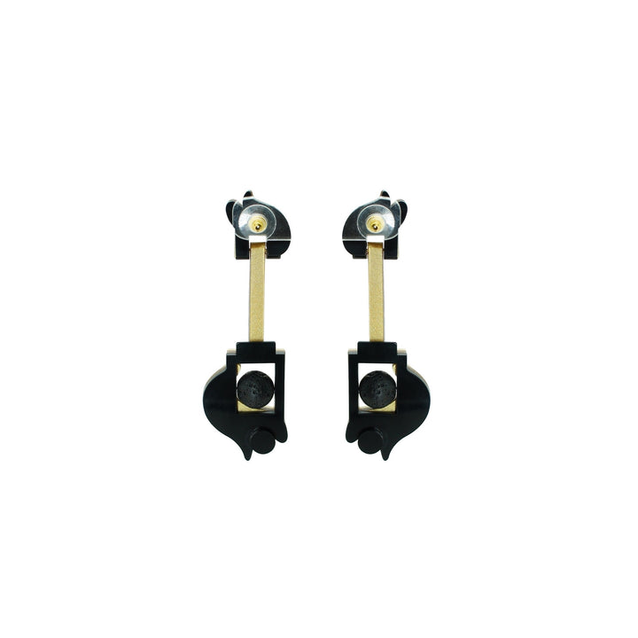 These dangle earrings are made from acrylic, brass with a golden finish, and volcanic lava beads. They are handmade by Brazilian artisans.
