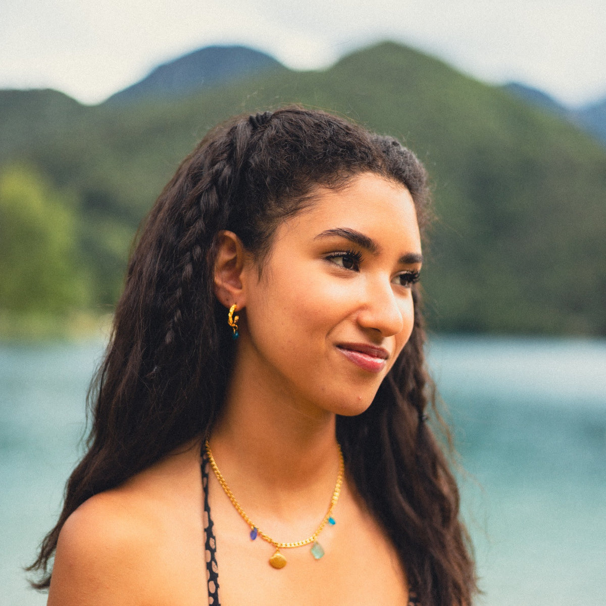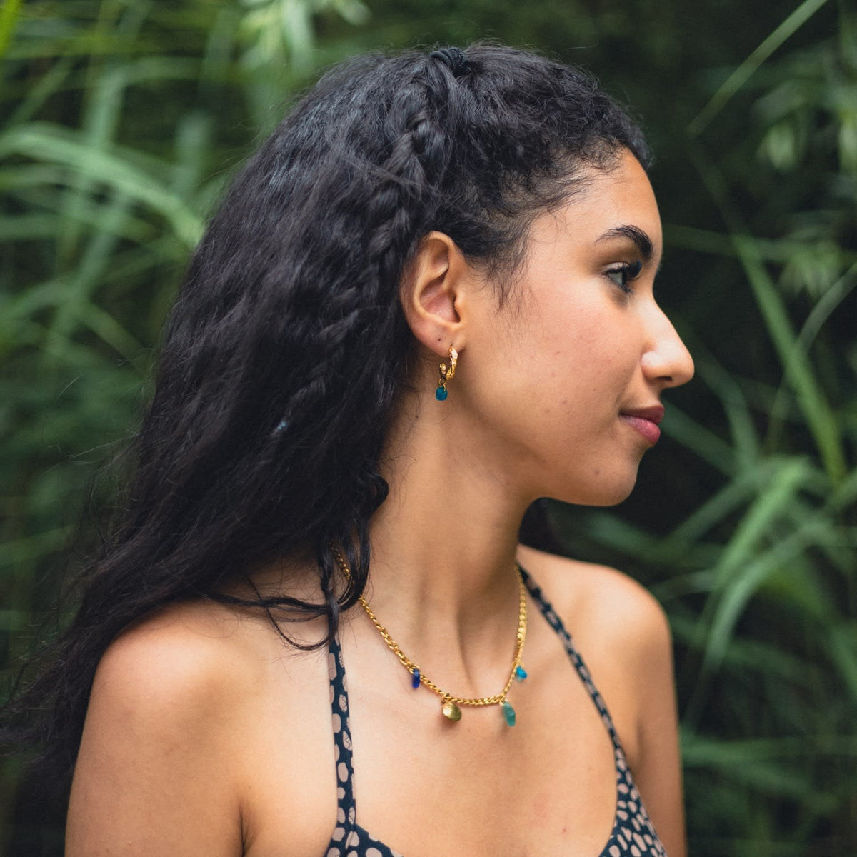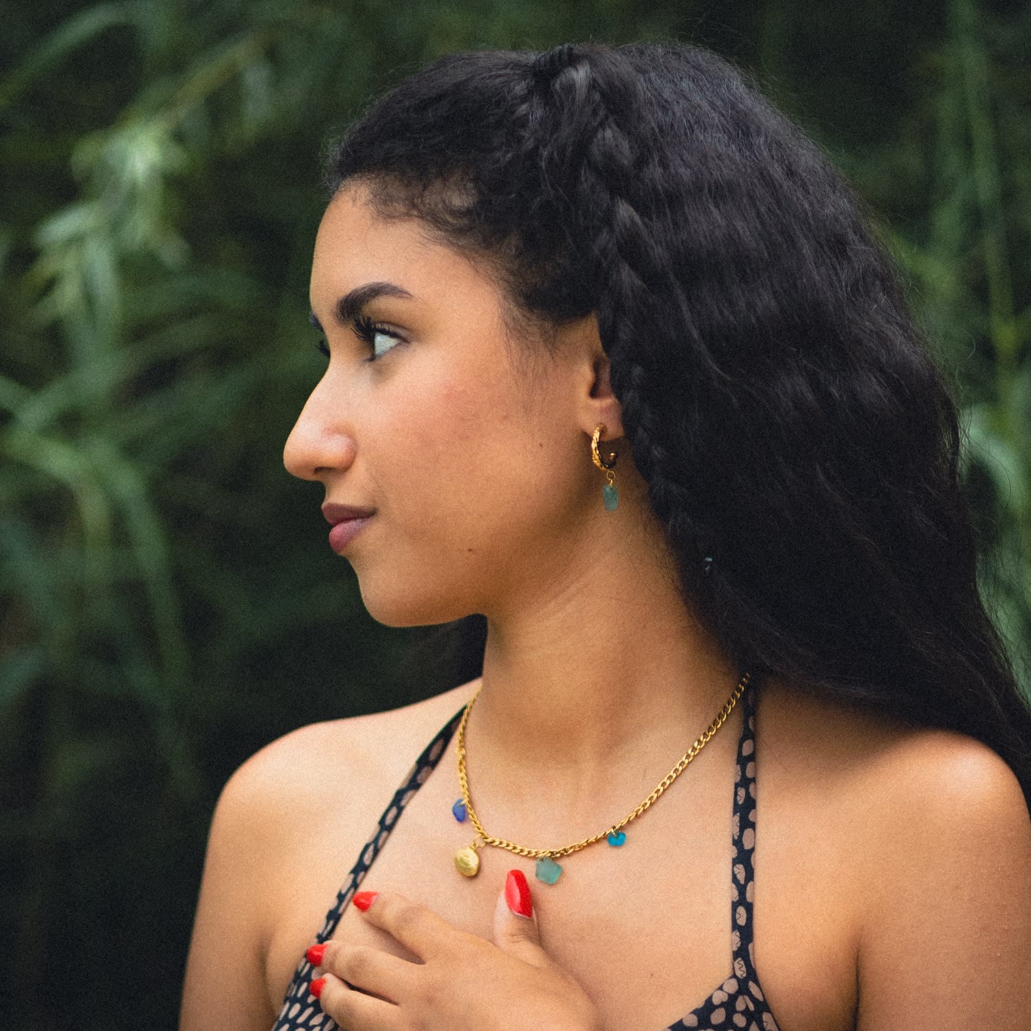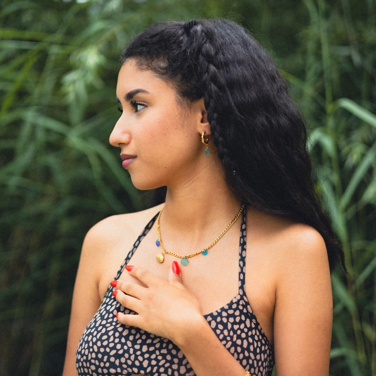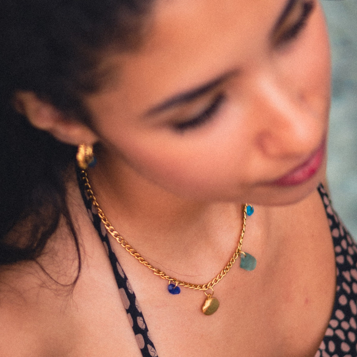 This necklace is made of PVD-coated 18kt gold-plated stainless steel with blue sea glass. It is waterproof.
