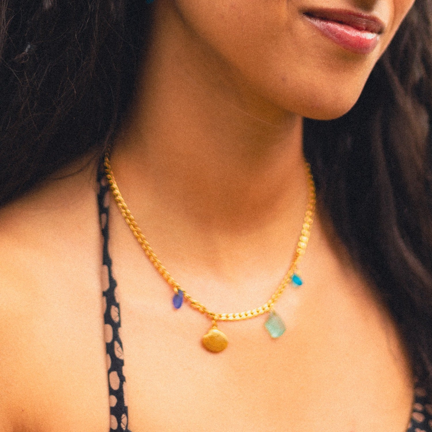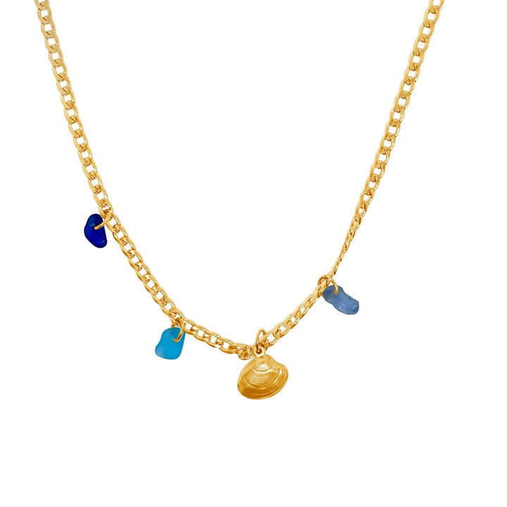 This Shells Necklace Blue Sea Glass Gold by Glasstyk is a beautiful and meaningful accessory. The blue sea glass, symbolizing calm, harmony, and peace, is a gentle reminder of the sea's tranquil waves. This necklace is a perfect piece to bring a sense of inner peace and balance to your busy everyday life.