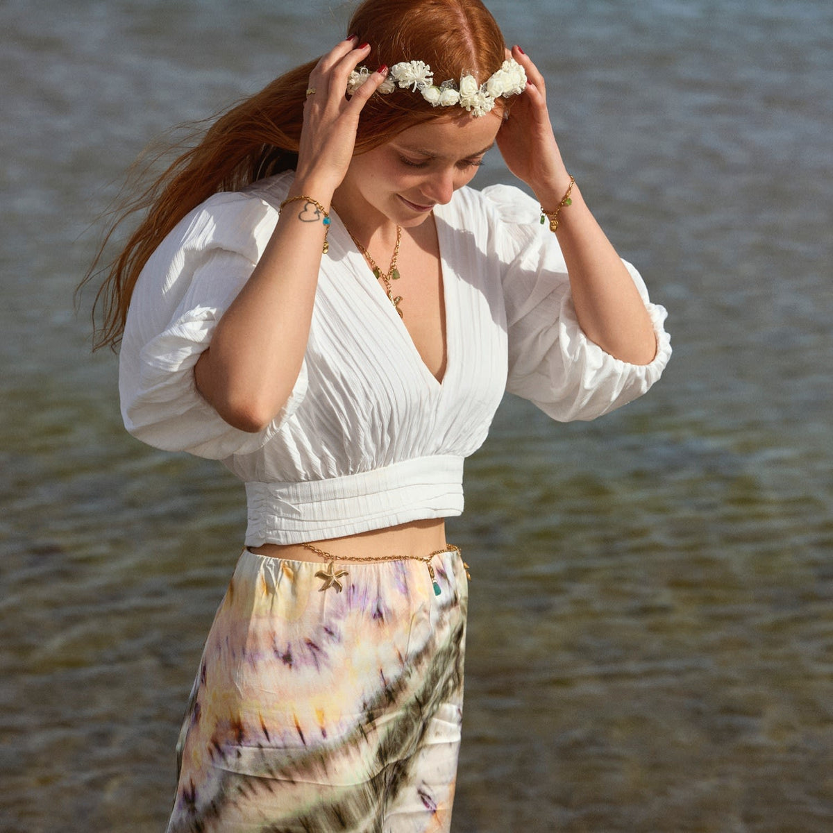 This belly chain is made from 18-karat gold-plated stainless steel with blue and green sea glass. It is Pvd-coated and waterproof.