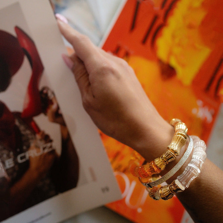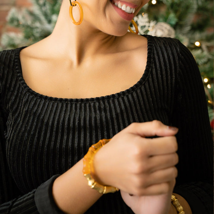 The Bamboo Bangle Bracelet In Clear by Gold & Honey is a statement bangle with a bamboo-inspired design. It can be worn with the lucite up or the gold up for a luxe look. This lightweight lucite bangle is a must-have accessory that's perfect for layering with other bracelets.