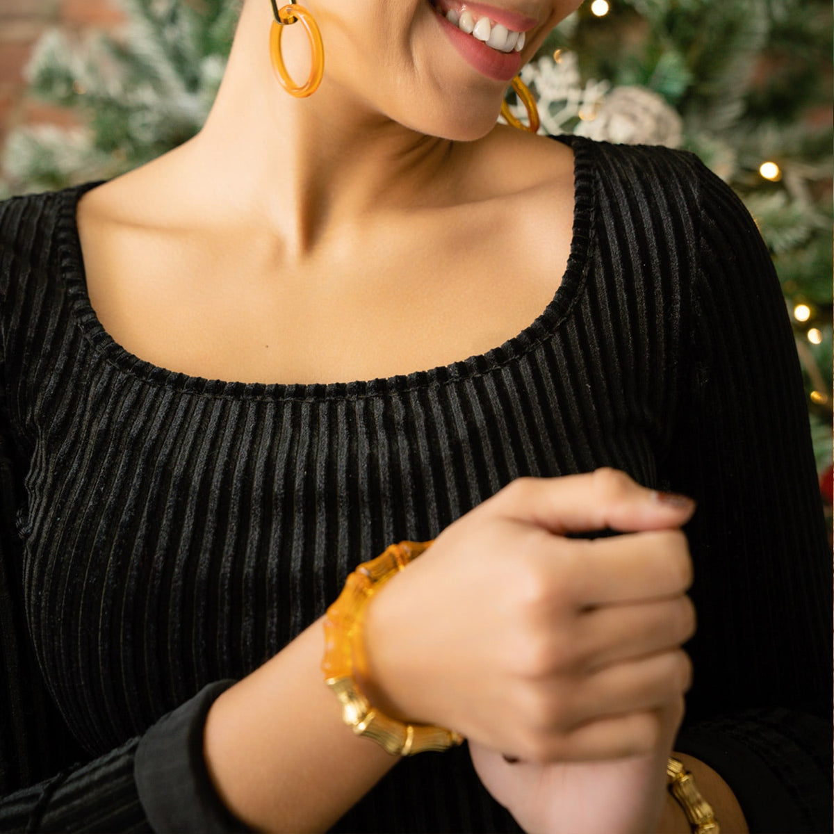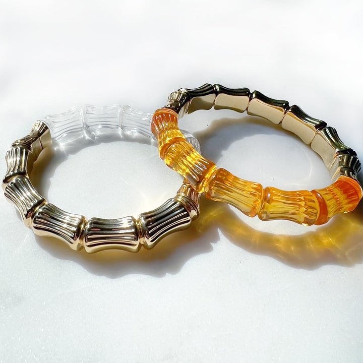 The Bamboo Bangle Bracelet In Honey by Gold & Honey is a statement bangle with a bamboo-inspired design. It can be worn with the lucite up or the gold up for a luxe look. This lightweight lucite bangle is a must-have accessory that's perfect for layering with other bracelets.