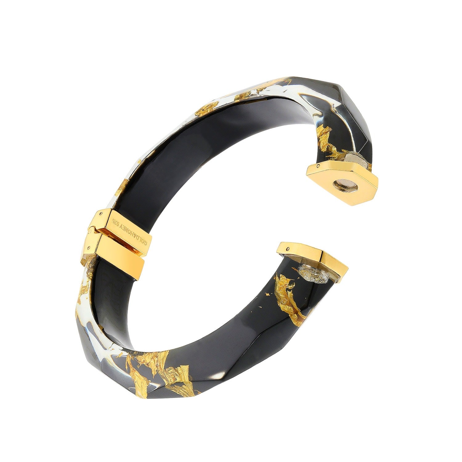 This bangle is made of lightweight lucite, infused with 24K gold leaf and hand-painted. It features a 14K gold-plated sterling silver hinge with a magnet.