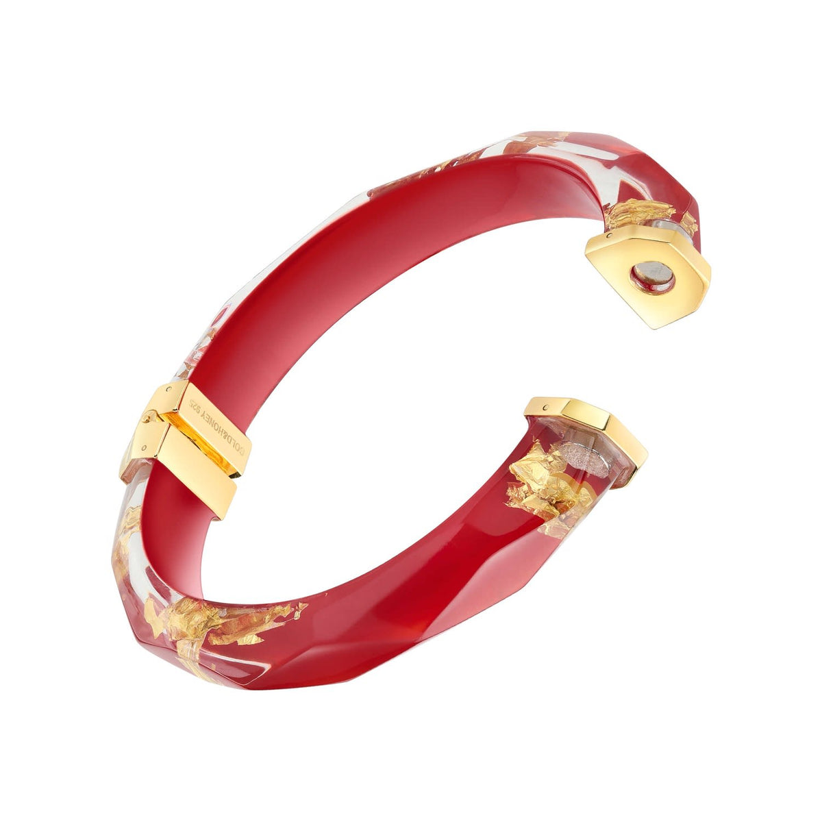 The 24K Gold Leaf Lucite Bangle by Gold & Honey is a must-have accessory for a sophisticated statement. The carnelian red color and faceted design are enhanced by a hand-painted hint of shimmer and an infusion of 24K gold leaf. The magnetic hinge makes it easy to stack with other bangles for a unique look.
