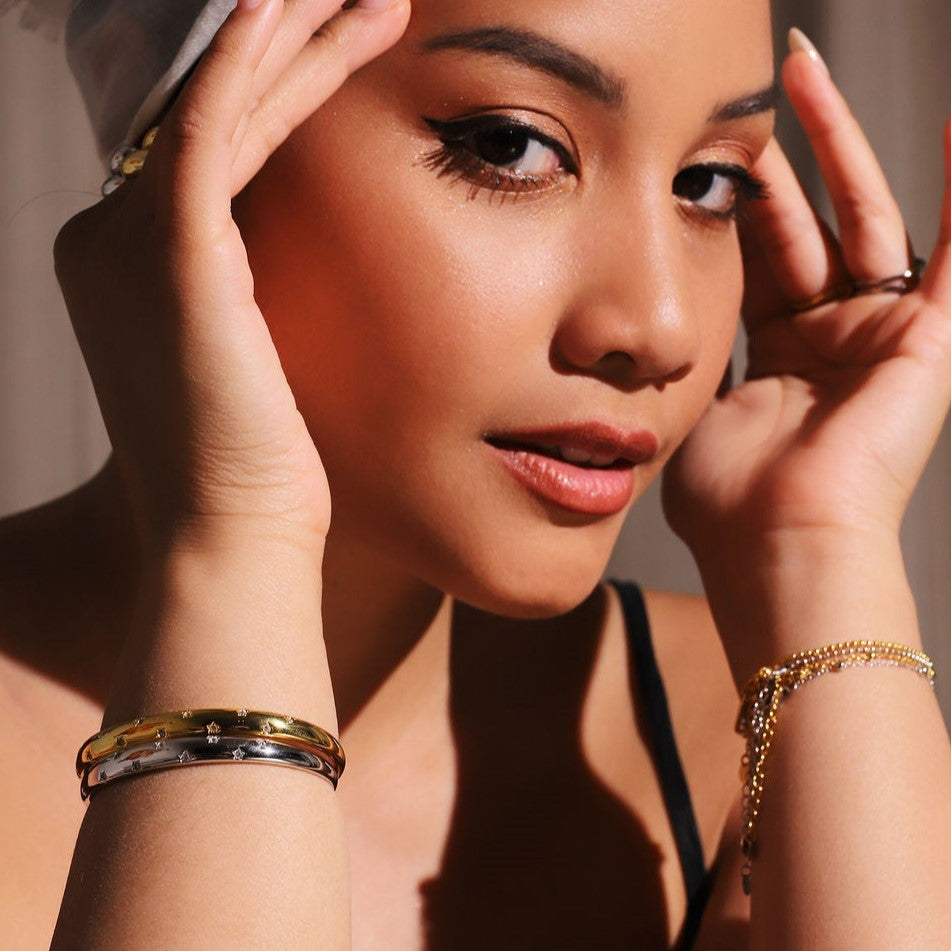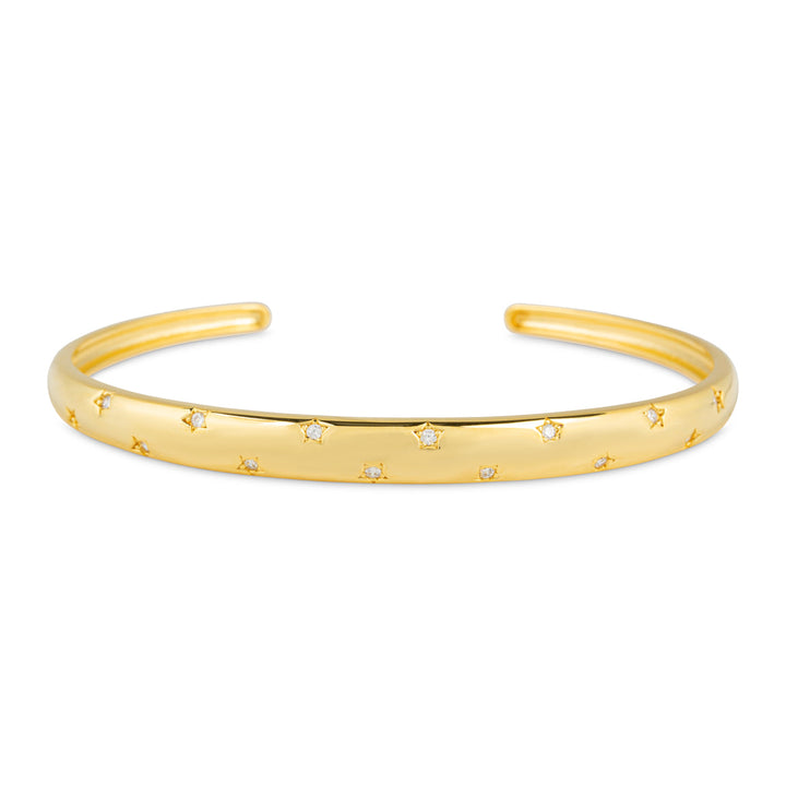 The Starry Night Bangle by Gold Trip is a delicate and versatile statement piece. It is crafted from 925 sterling silver and plated with 18ct gold, featuring 14 pavé-set cubic zirconia stones for a brilliant sparkle. The bangle is available in two sizes and can be worn alone or stacked with other bracelets. It is designed to be a durable yet delicate accessory that adds a touch of shine to any outfit.