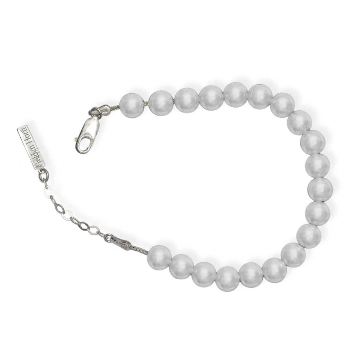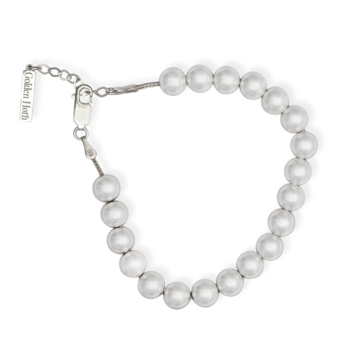 The Silver Pearl Bracelet by Golden Horn Jewellery is a hand-crafted bracelet that exudes divine elegance. It features lustrous sterling silver beads that resemble pearls, symbolizing prosperity and celestial beauty. This piece is a beautiful reminder of the boundless abundance around you, designed to add a touch of magic to your life.