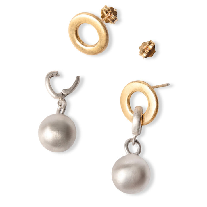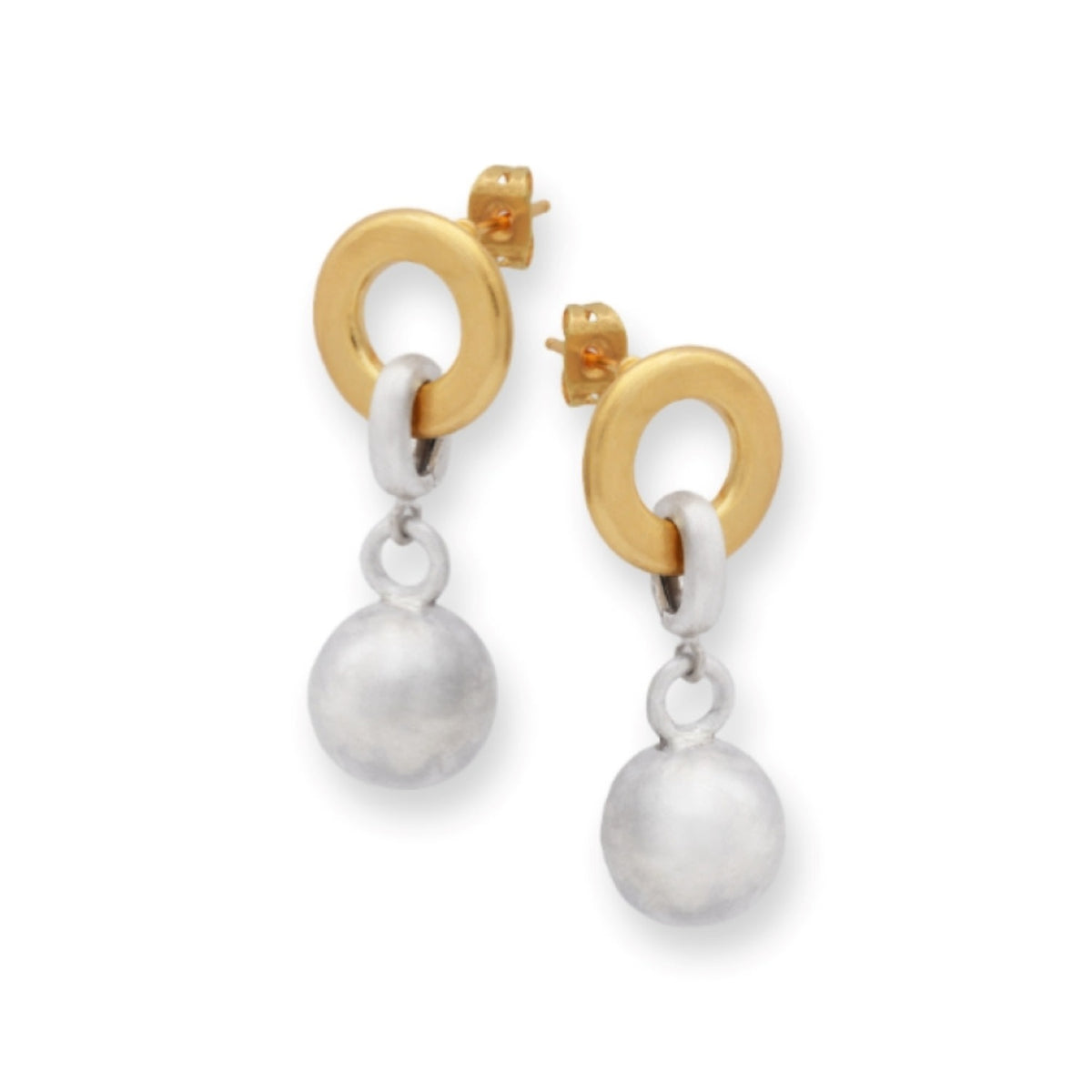 The Silver Bead Gold Circle Drop Earrings by Golden Horn Jewellery are a minimalist and celestial accessory. They feature a shimmering silver bead with a golden circle, symbolizing the unity of the sun and moon. The versatile bead can also be used as a pendant, adding to the elegance of these lightweight drop earrings.