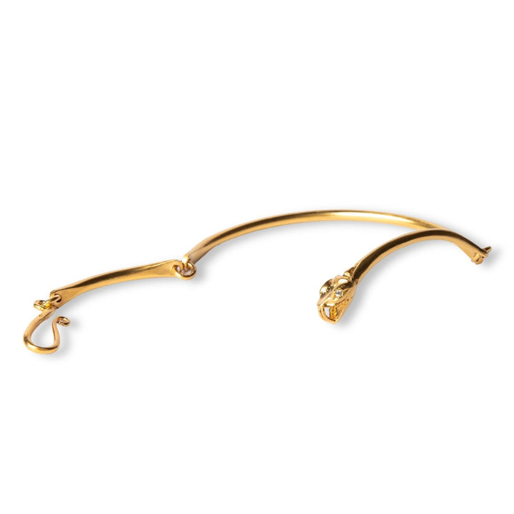 This Ouroboros Snake Gold Plated Bracelet by Golden Horn Jewellery is a striking and symbolic piece. The bracelet is meticulously handmade and features an intricate snake design that forms a continuous loop. This design, known as the Ouroboros, symbolizes the endless cycle of transformation and growth, making the bracelet a powerful reminder of endurance and new beginnings. It is perfect for everyday wear or as a statement accessory.