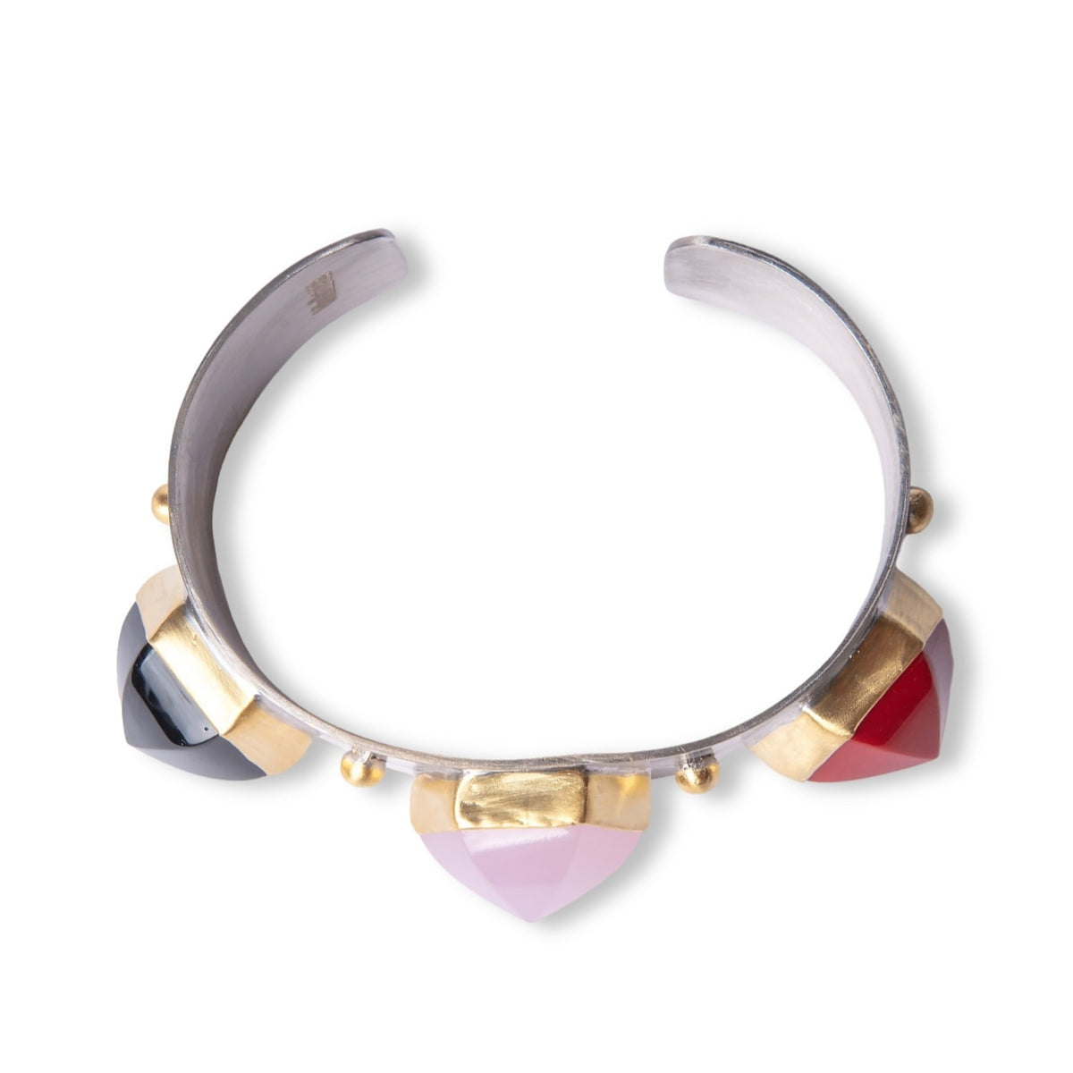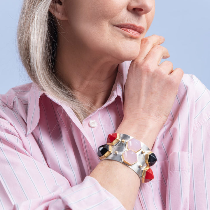 The Triple Pink Quartz Dome Silver Cuff Bracelet is a handmade masterpiece that symbolizes hope and new beginnings. This cuff features three luminous moonstones nestled in dome-like settings, inspired by the architectural beauty of a hammam. It is made from 925 sterling silver with 24k gold-plated parts.
