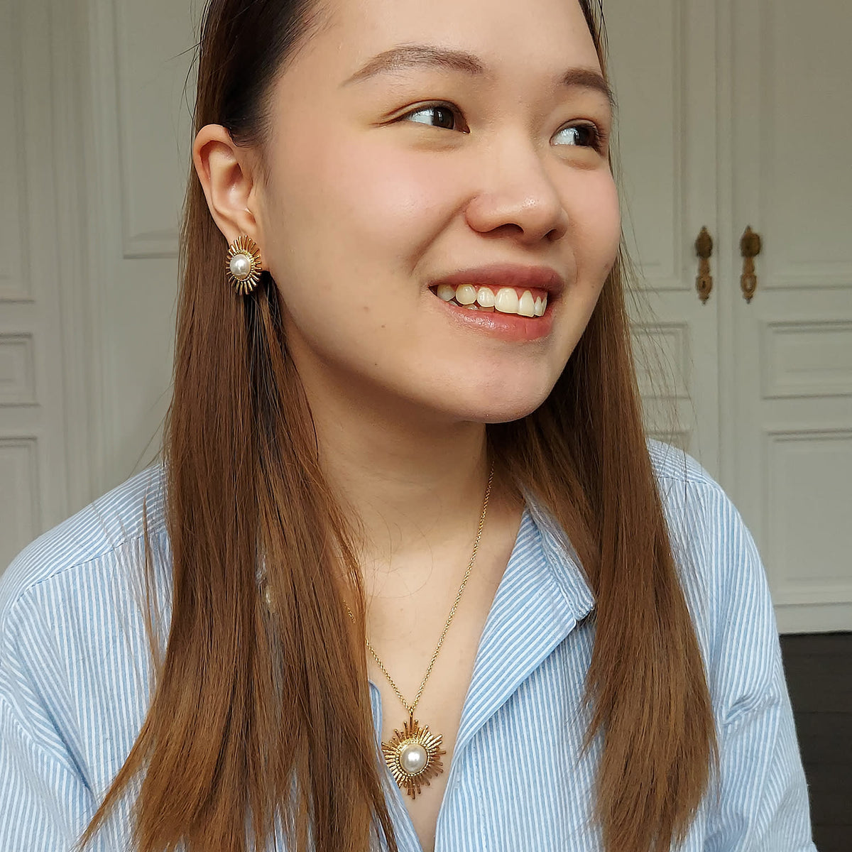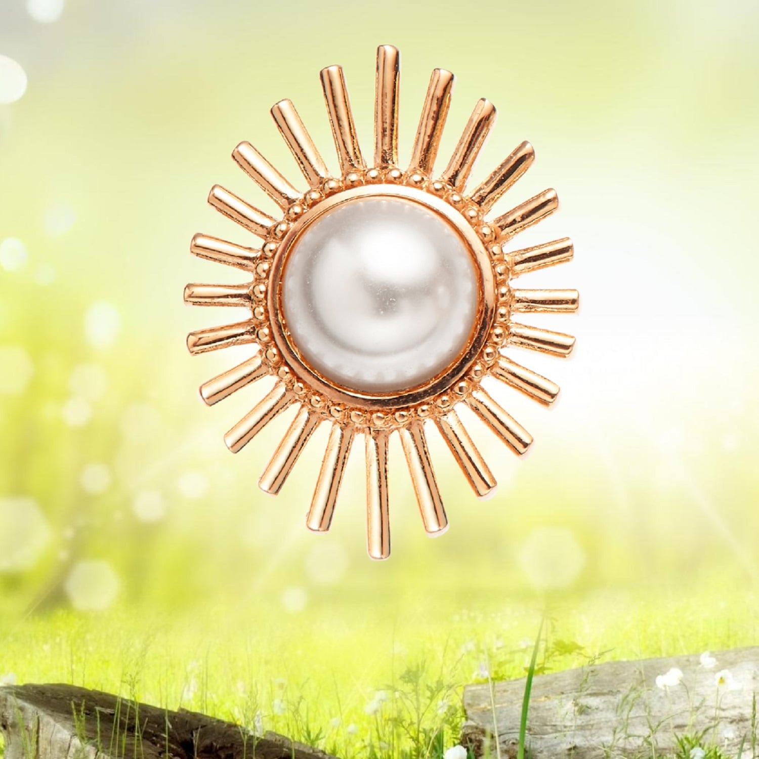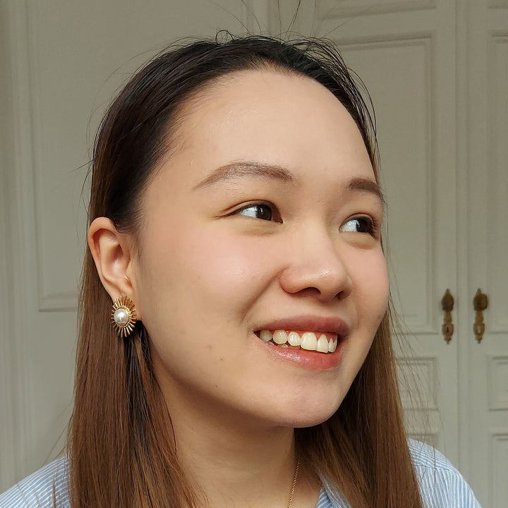 These Gold & Pearl Earrings, Series Future Floral by Grossé are a radiant and futuristic accessory. The earrings are shaped like a flower with petals resembling sunbeams, and have a shiny crystal pearl at their heart. Fully plated with 23 carat gold, they are a beautiful statement piece that adds a touch of modern luxury to your look.
