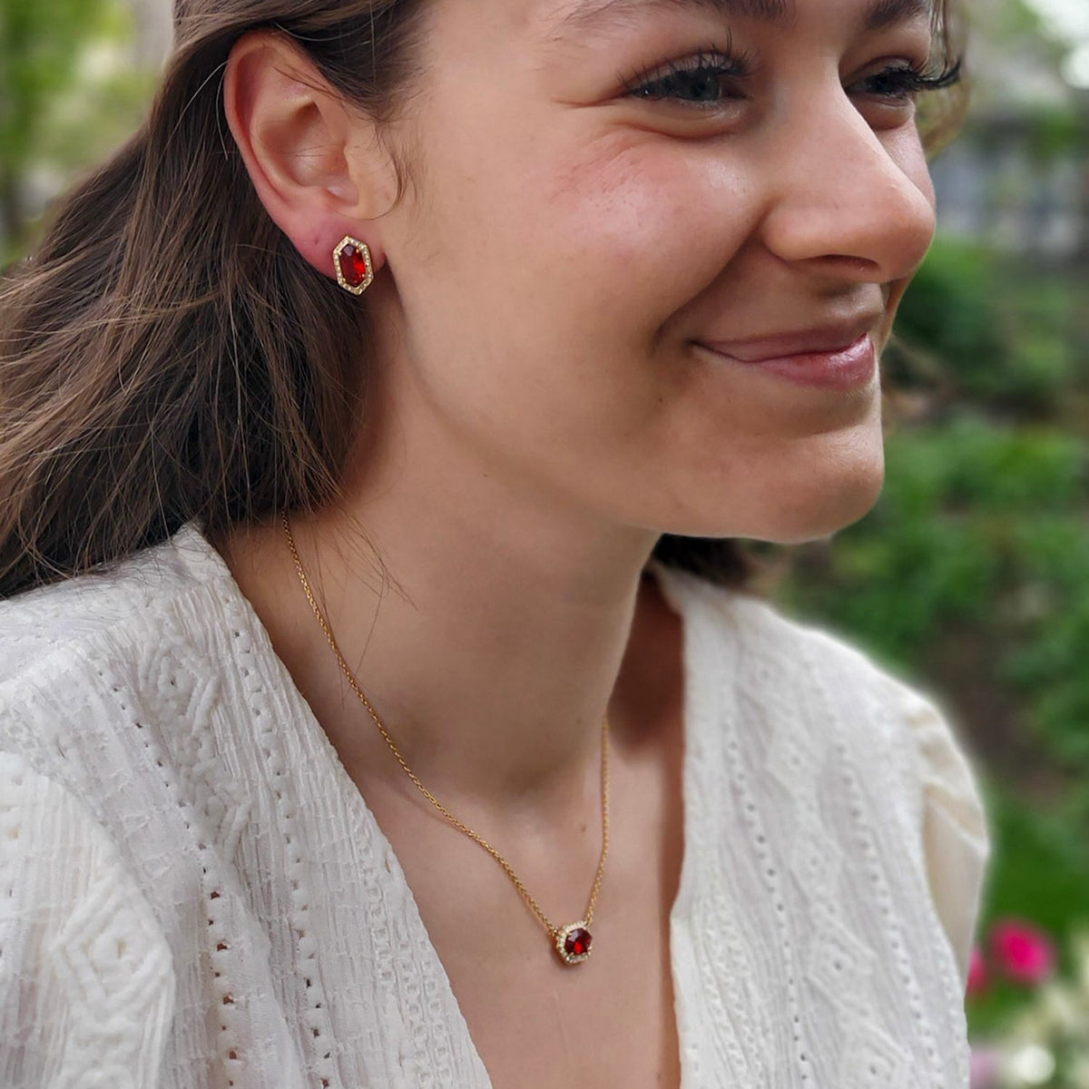 These Gold & Red Crystal Earrings, Series Jelly Beans by Grossé are an elegant and classic accessory with a playful twist. These stud earrings feature a subtle crystal heart in the shape of a jelly bean, surrounded by small, sparkling crystals. Their timeless design adds a touch of shine and subtle color to any look, making them a perfect, everyday piece with a touch of sophistication.