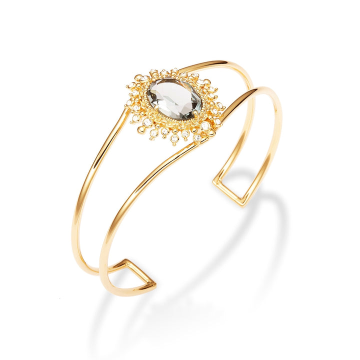 The Gold & Indian Sapphire Blue Crystal Bangle Bracelet by Grossé is a radiating and elegant piece from the Eclat Palette series. This open bangle features a beautiful Indian sapphire-colored Czech crystal in a gold sunburst setting. The design is accented with rays of clear Czech crystals and golden beads. The bangle is slightly bendable for easy wear and comes in a luxurious gift box.