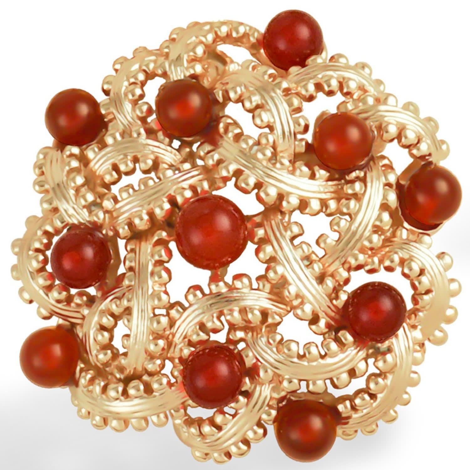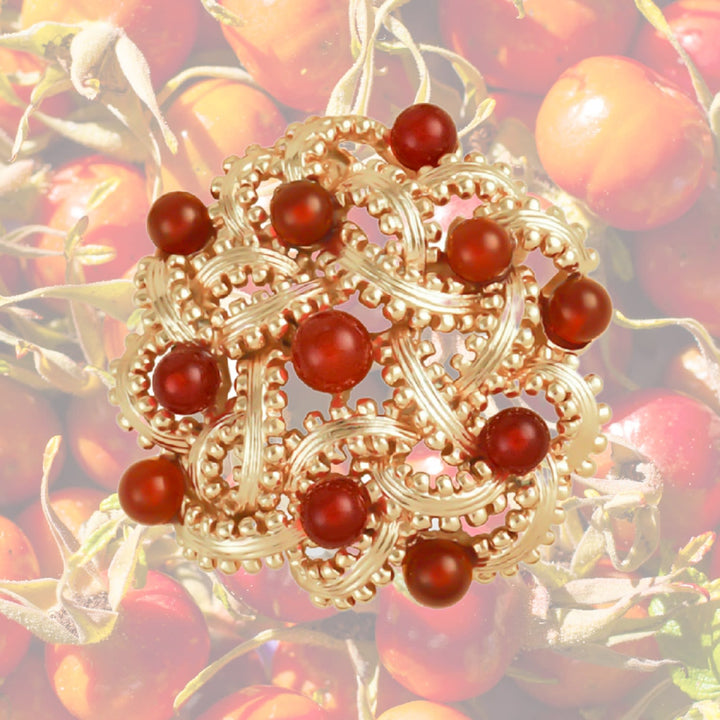 These clip-on earrings are plated with 23-karat gold. They are set with 11 red agate gemstones, each with a diameter of 3 millimeters. The earrings measure 25mm by 24mm.