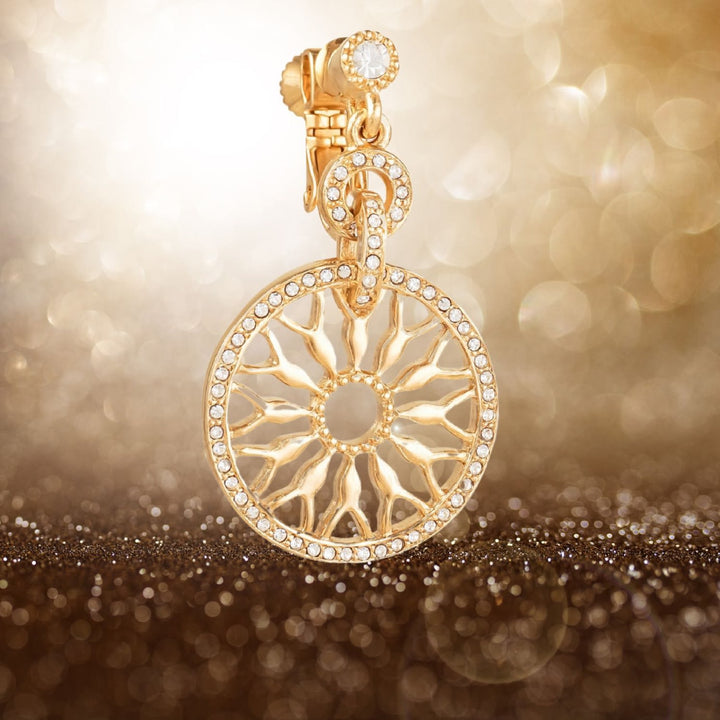 The Gold & Crystal Clip On Drop Earrings, Series Lumière by Grossé are drop earrings from the "Lumière" series. They are made of 23-karat gold-plated metal and are encrusted with shiny Czech crystals. They have a screw clip for a secure fit on both non-pierced and pierced ears. The earrings measure 34 by 20 millimeters.