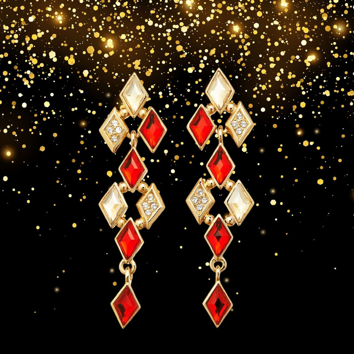 Light Siam Red, Clear & Golden Shadow Crystal Statement Drop Earrings, Series Glitter