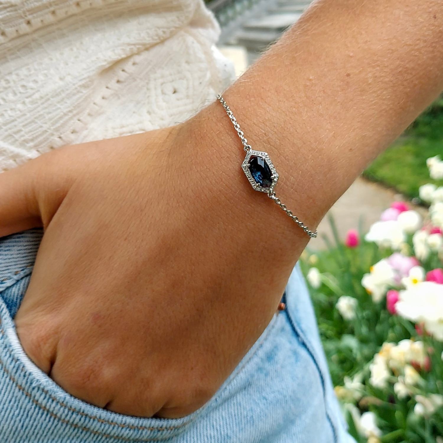 This necklace is fully platinum plated and features a dark blue crystal heart surrounded by Czech crystals. It is 38cm long with a 5cm extension piece.