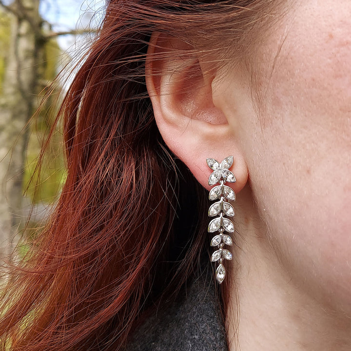 The Platinum & Crystal Drop Clip On Earrings by Grossé are a majestic and impressive statement piece. These leaf-shaped earrings, from the Cocktails series, feature shimmering Czech crystals that hang beneath each other, creating a striking and sophisticated look.
