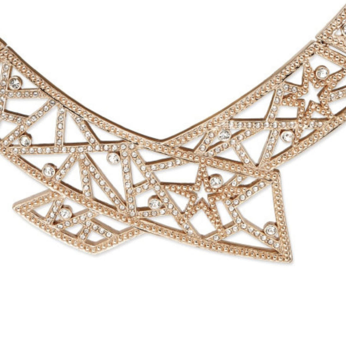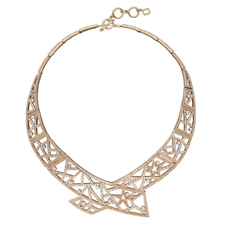 This Gold & Crystal Statement Necklace by Grossé is a gorgeous and dramatic piece from the "Star Flake" series. Its special design extends from narrow to wide, with abstract golden shapes encrusted with shining Czech crystals and two decorative stars. The entire necklace is luxuriously 23-carat gold plated, making it a truly radiant addition to any collection.
