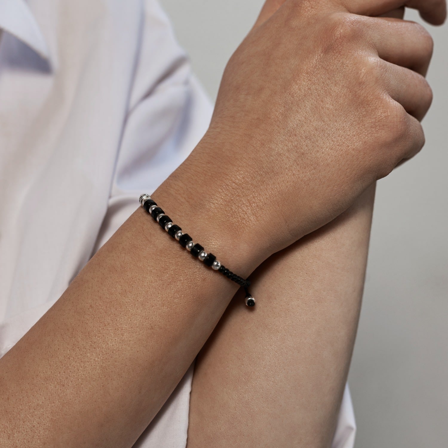 This unisex bracelet is made with black onyx, rope, silver, and steel. The rope is a vegan-friendly cord.