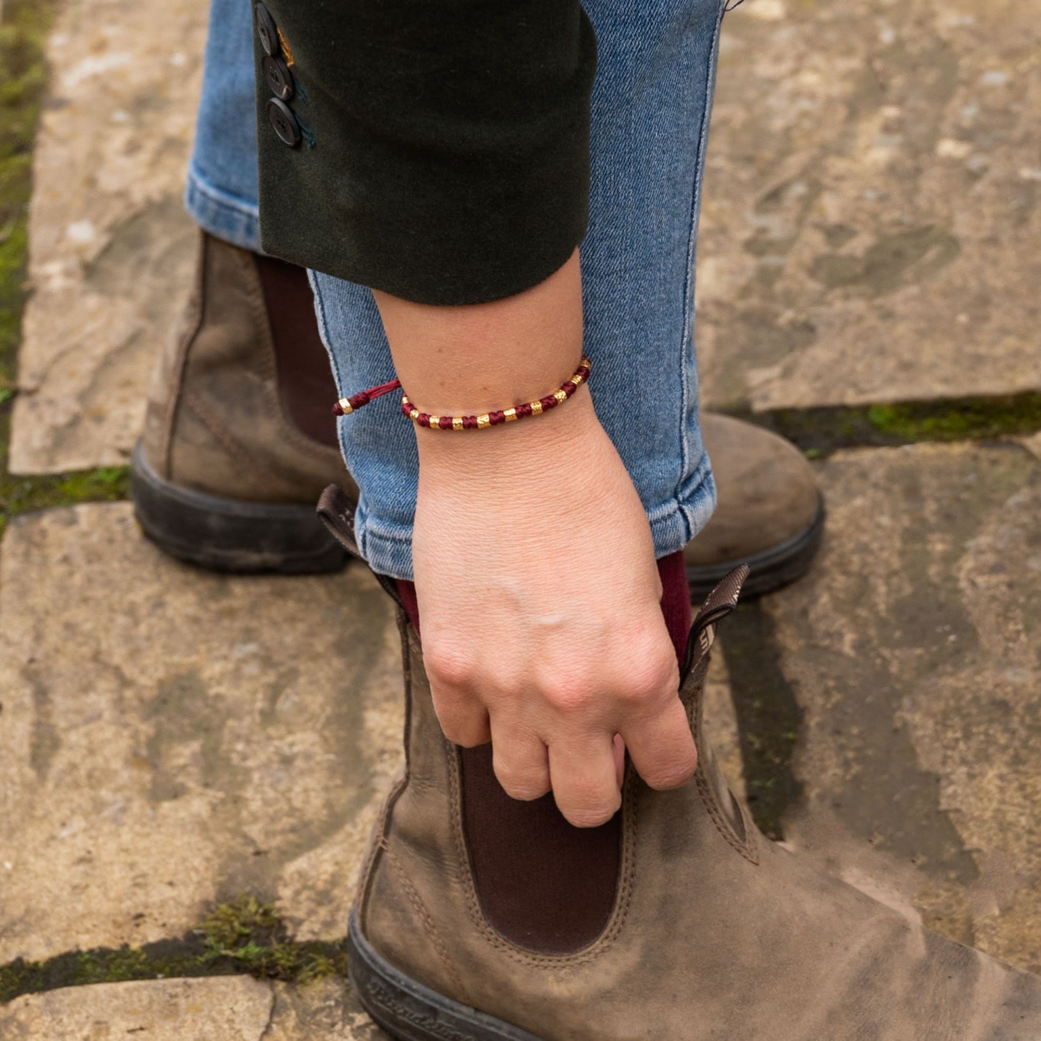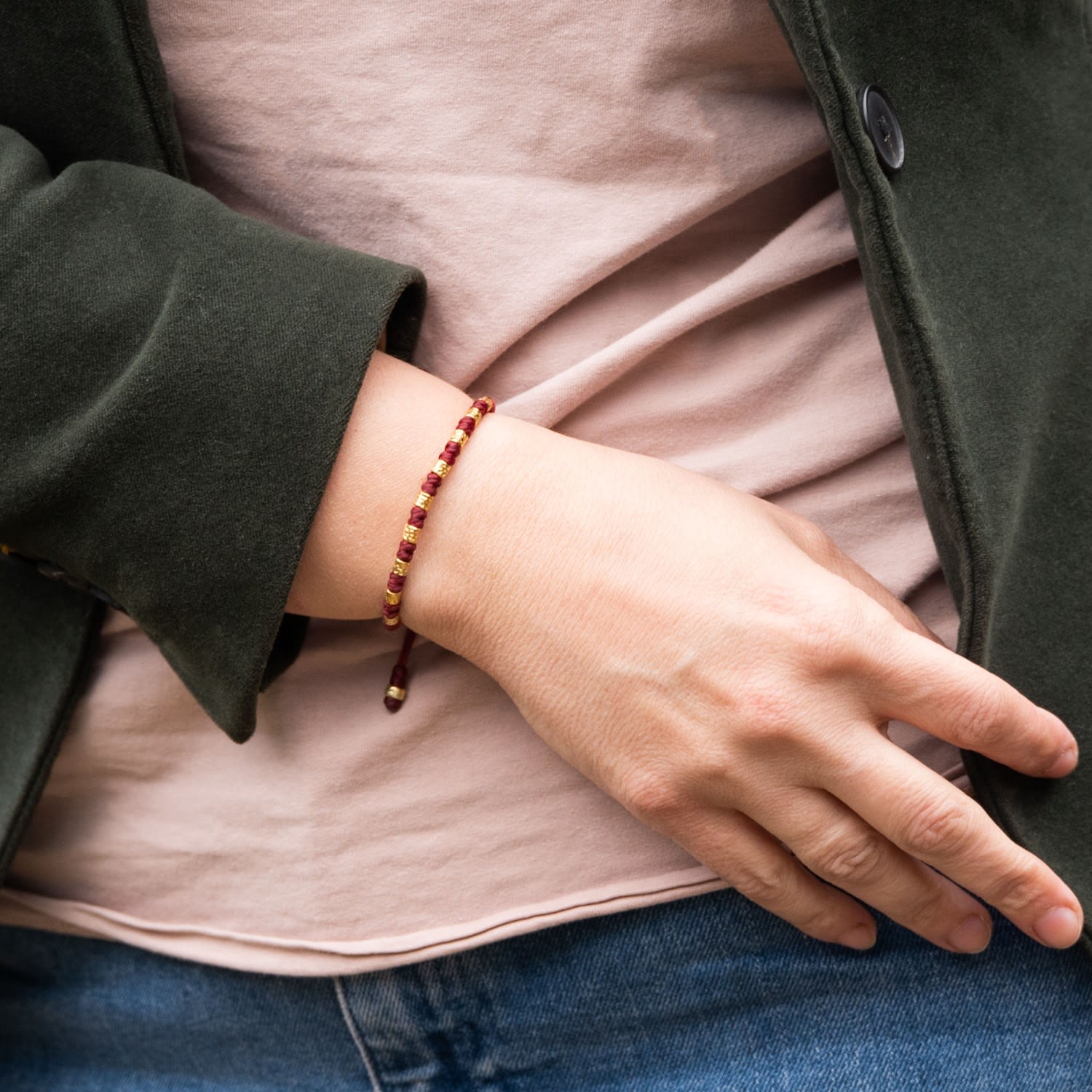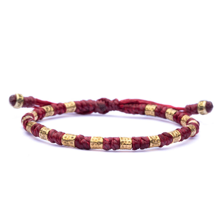 This bracelet is crafted with hammered vermeil gold beads and a waxed red cord. The vermeil is 1 micron thick.