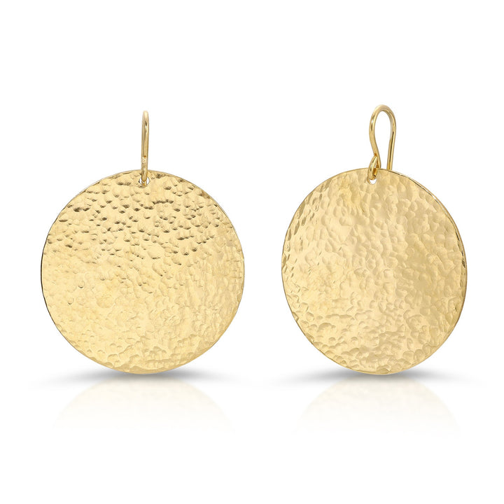 These earrings are made from 14K Gold-Filled material, featuring 32mm (1.25 inches) hand-hammered discs on gold-filled earwires. A sterling silver option is also available.