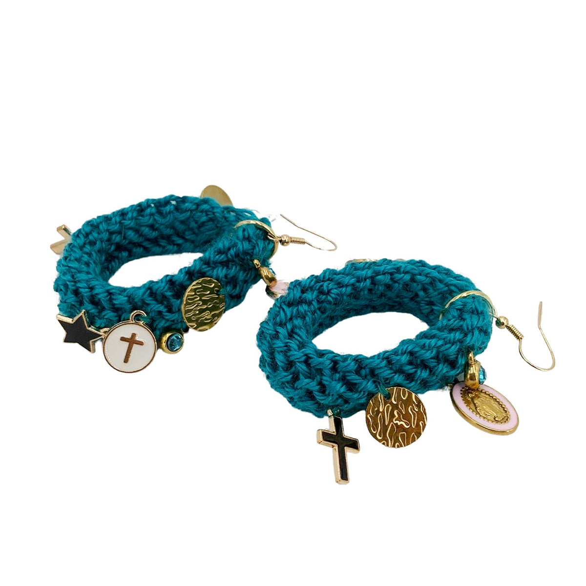 These earrings are crafted from acrylic thread with stainless steel gold-plated, nickel-free hardware. Each pair is hand-knitted and may vary slightly in size, shape, and color.