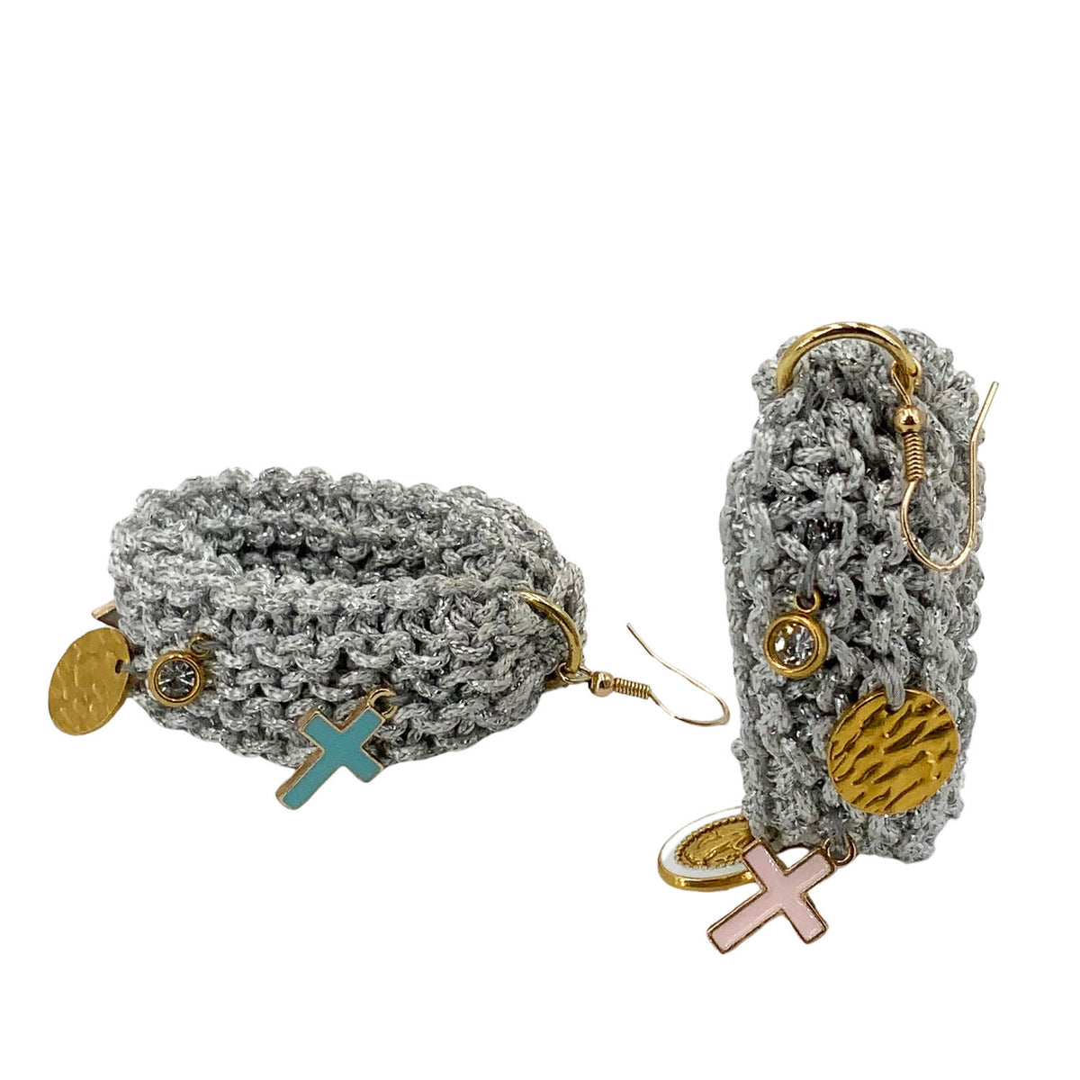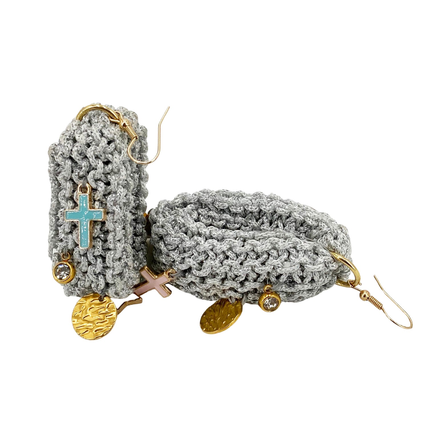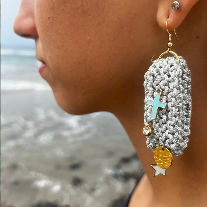 These Drop Earrings with Charms - Silver by Hilo De Mar are a celebration of meticulous craftsmanship and conscious living. Hand-knitted in Madrid, their lightweight and soft feel makes them ideal for everyday wear, while their unique design elevates them for special occasions. Each pair is a labor of love, blending traditional techniques with contemporary style. These earrings are more than just an accessory; they embody an ethical and sustainable approach to fashion, making them a personal statement of thoughtful beauty.
