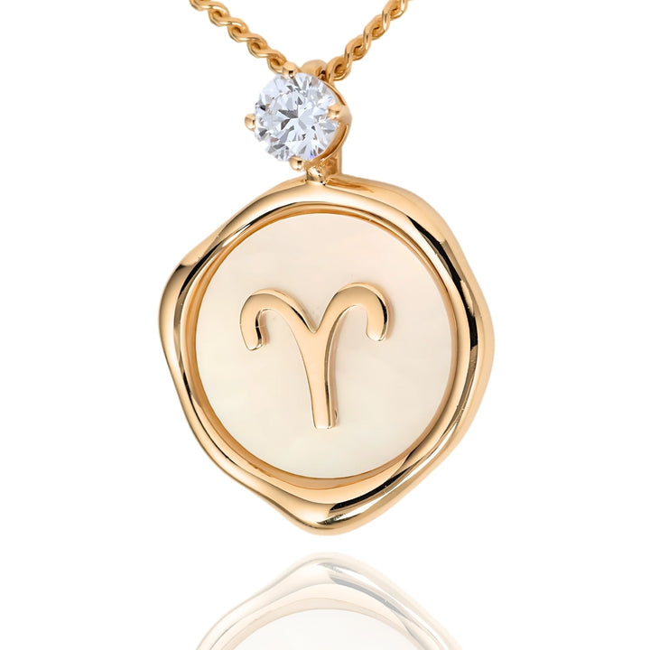 The Aries Zodiac Necklace by Hinch & Liu is a beautifully crafted piece inspired by the ancient method of wax seals. It features a central zodiac symbol for the bold and assertive Aries, raised from a bed of mother-of-pearl and encircled by an elegant asymmetrical rim. Adorned with a stunning lab-grown diamond, this necklace is a perfect blend of subtle elegance and shimmering beauty.