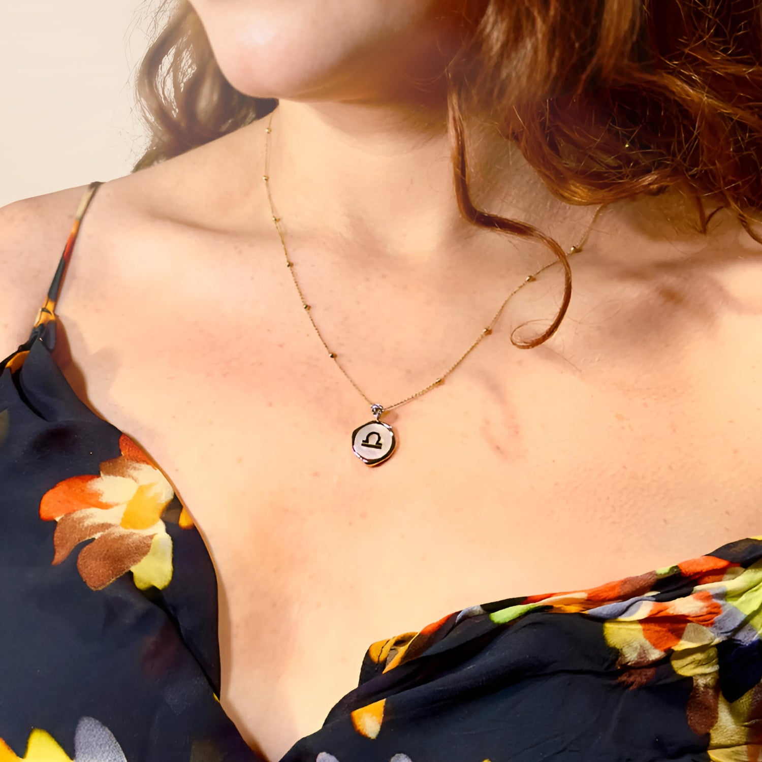 The Libra Zodiac Necklace by Hinch & Liu is a beautiful and symbolic piece inspired by the ancient wax seal. The pendant features the Libra zodiac symbol raised on a bed of mother of pearl, with an elegant asymmetrical rim. It is adorned with a stunning 0.2-carat lab-grown diamond, making it a subtle yet shimmering accessory. The pendant is crafted from sterling silver with an extra-thick 18-karat gold vermeil plating.