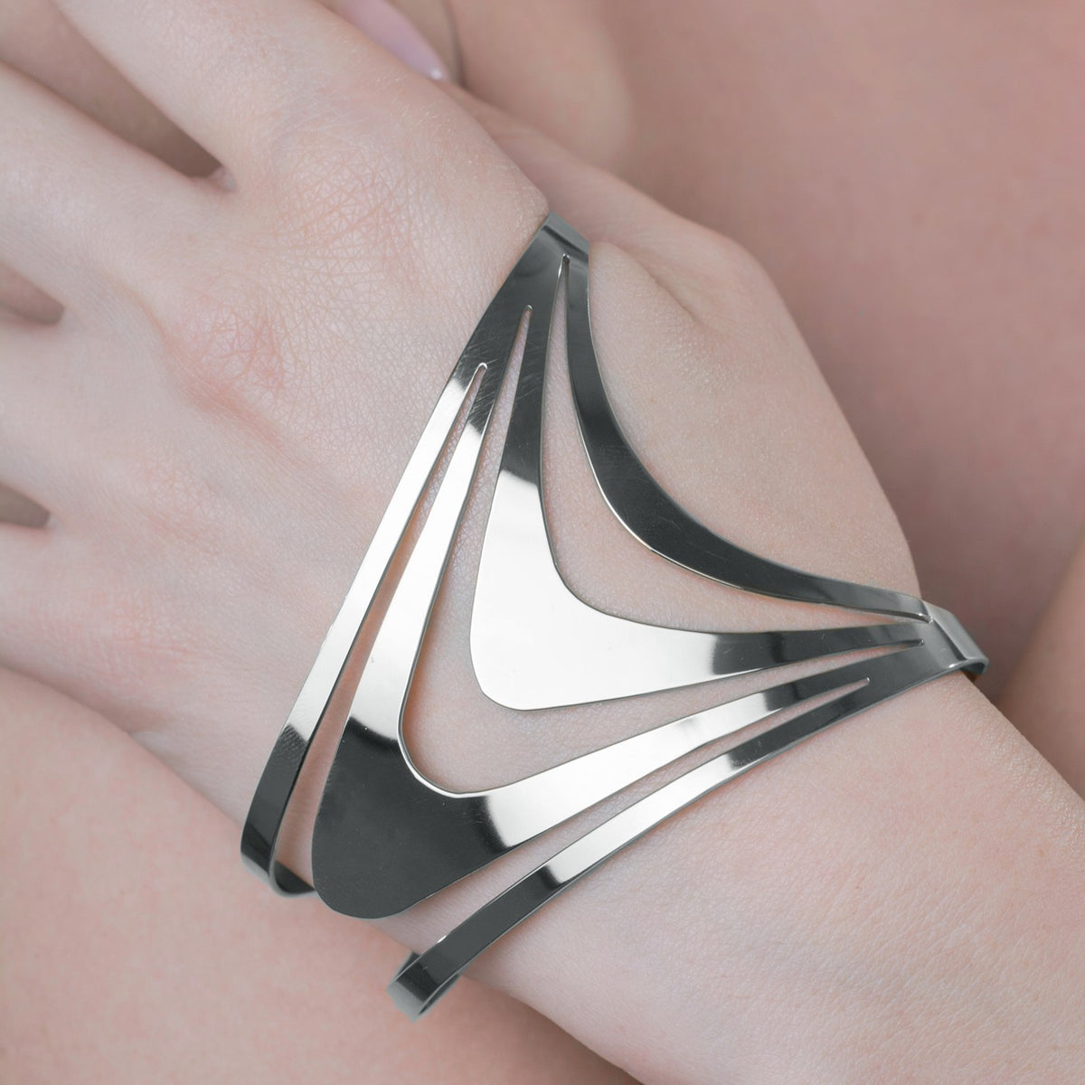This cuff bracelet is a wearable sculpture handcrafted from stainless steel.