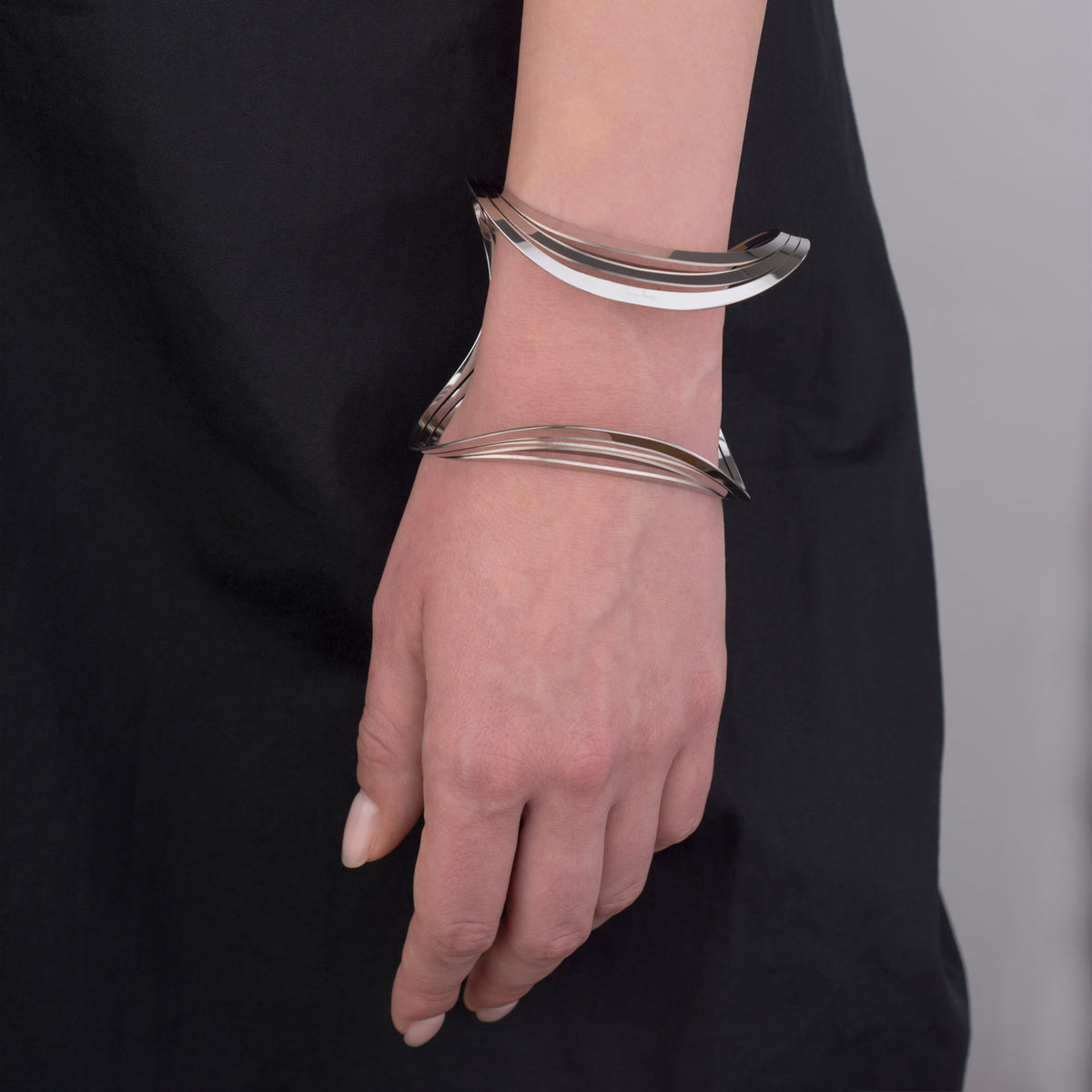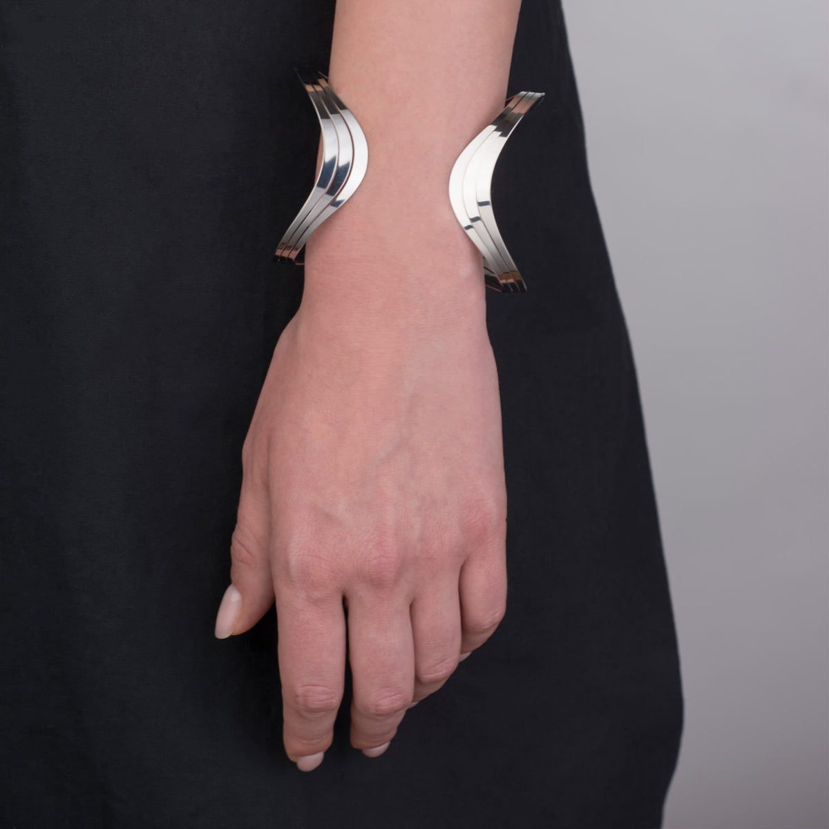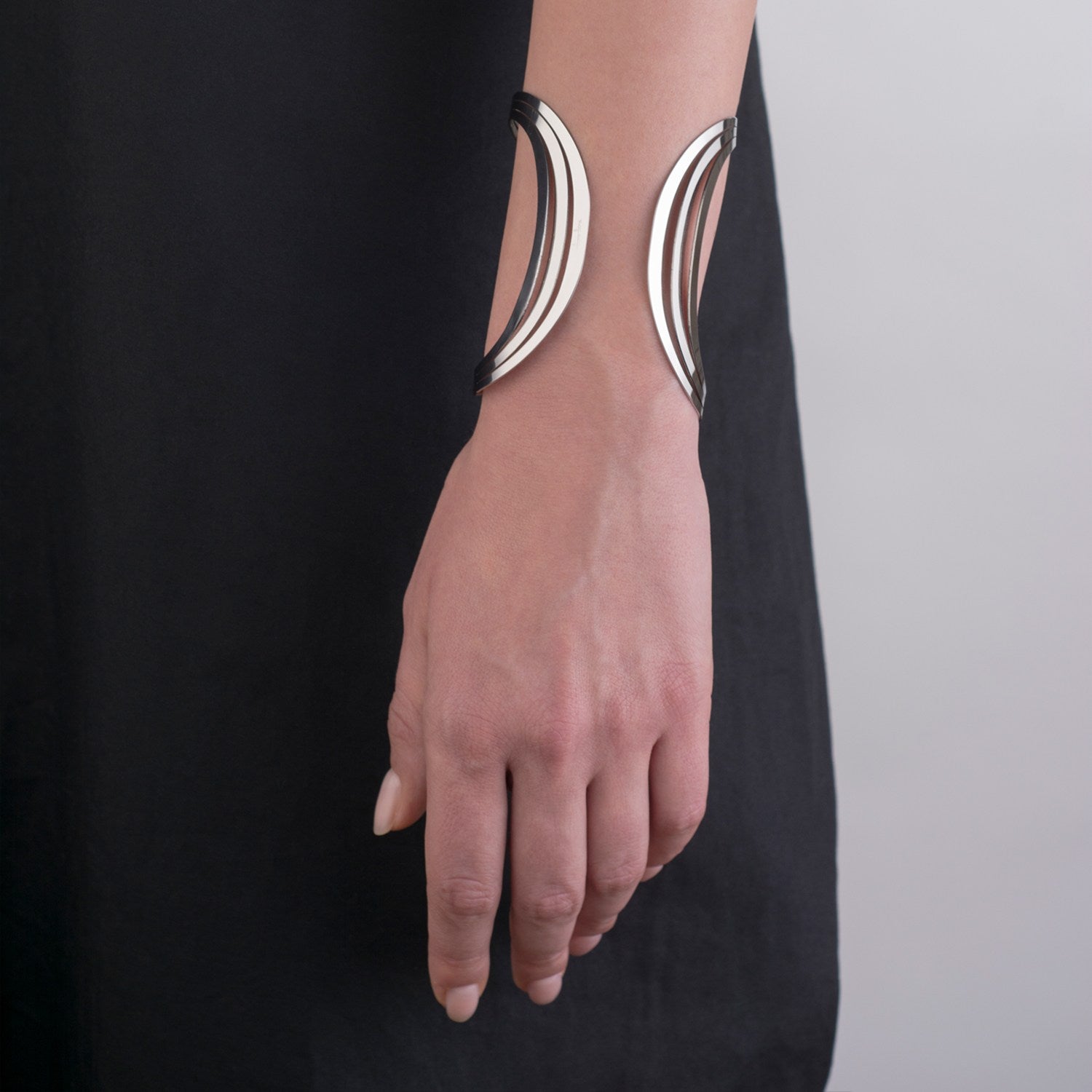 The Multiverse Bracelet by Hota Hota Jewellery is a versatile and sculptural cuff bangle. Its unique design allows it to be worn in four different positions, with each revealing a new perspective and character. Handcrafted from stainless steel, this bold and fluid piece is durable, hypoallergenic, and low-maintenance, perfect for those who love an edgy and versatile style.