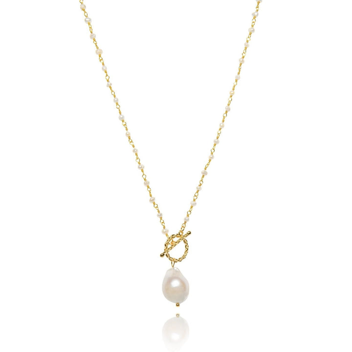 This Brooklynn Pearl Necklace by House of Elliott is a modern and detailed chain necklace. It features small freshwater pearls and a single large baroque-shaped freshwater pearl with a T-clasp. This versatile piece can be worn long or doubled up, making it a perfect blend of classic elegance and contemporary style.