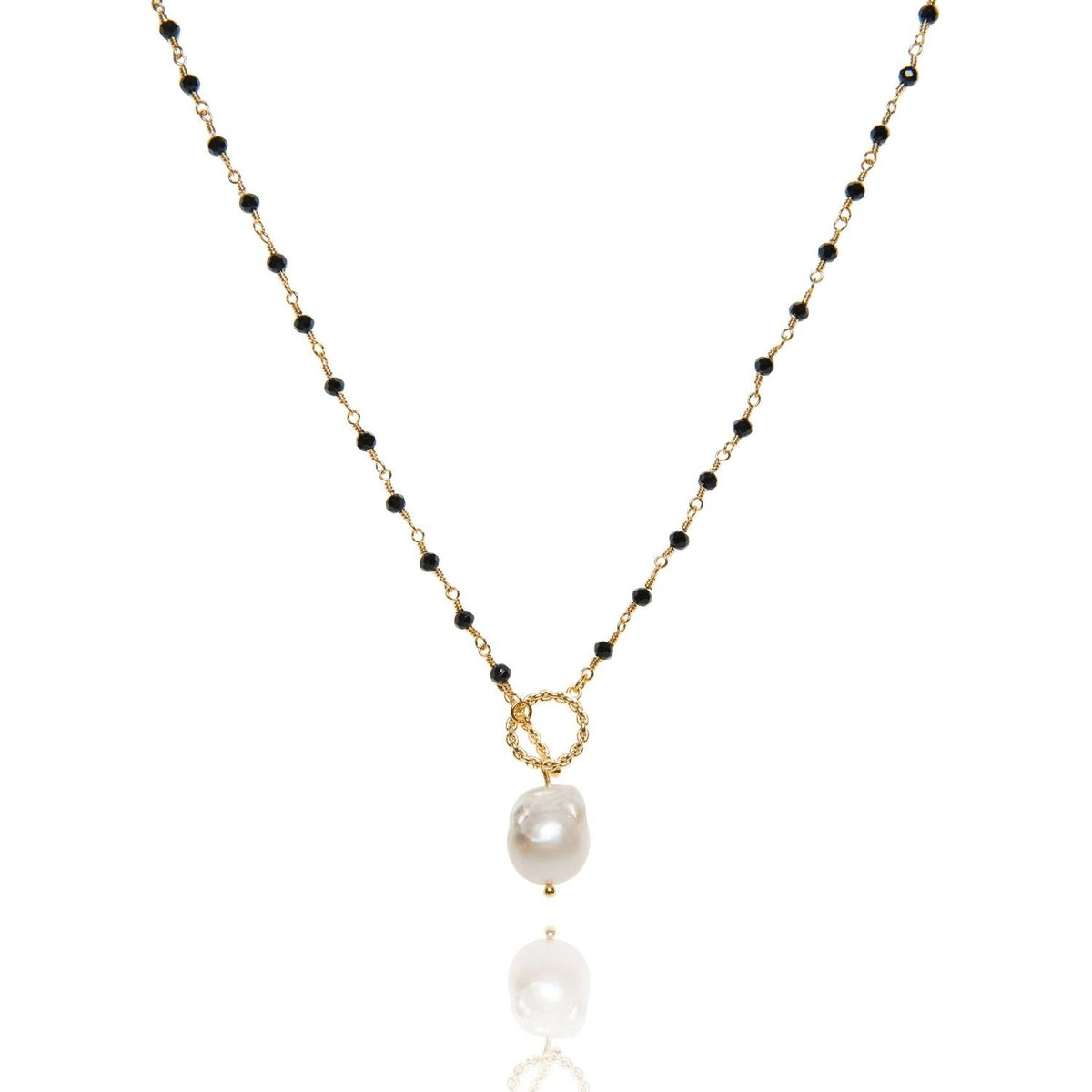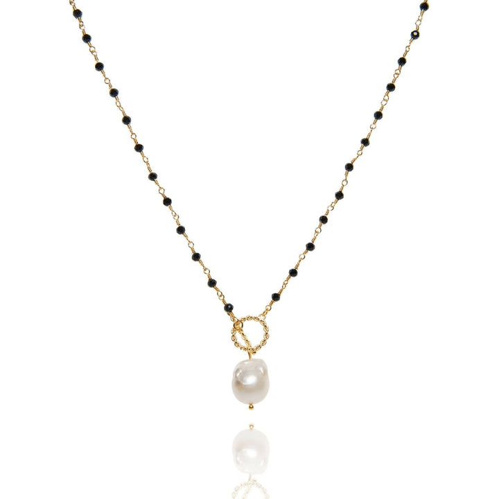 This necklace is made of 14k gold-plated brass and features a cultured freshwater pearl and black crystals. The baroque pearl is 13mm.