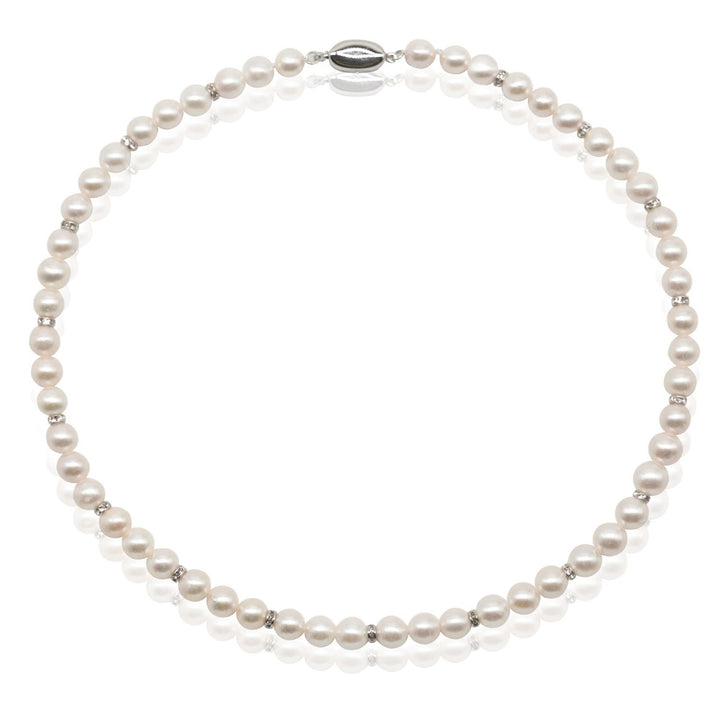 This necklace features 8mm Akoya saltwater pearls, silver pieces with zirconia details, and a silver clasp.