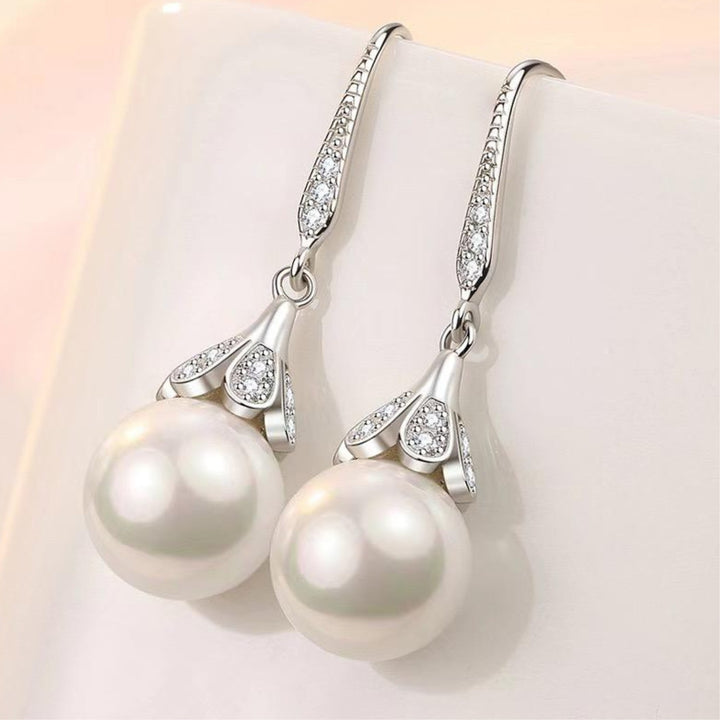 The metal parts of these earrings are brass with a thick layer of white gold plating. They feature seashell pearls and cubic zirconia (zircons).