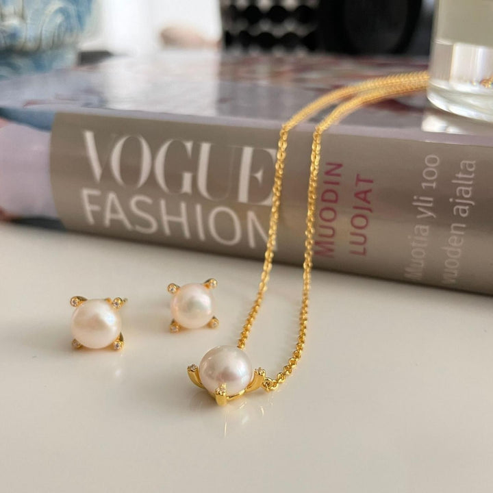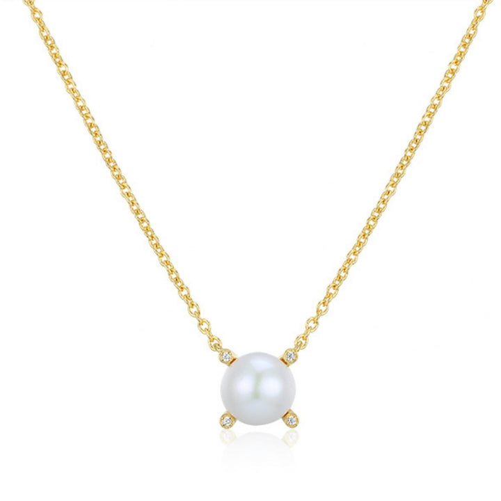 The chain is made of 18k gold-plated sterling silver. The necklace features a round, shiny 8mm freshwater pearl and colorful zirconia. The chain length is adjustable by 5 cm.