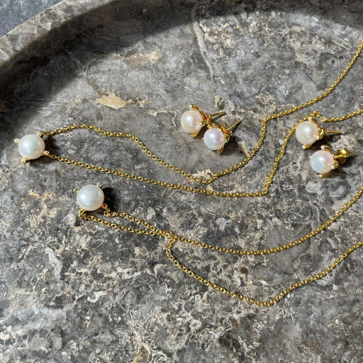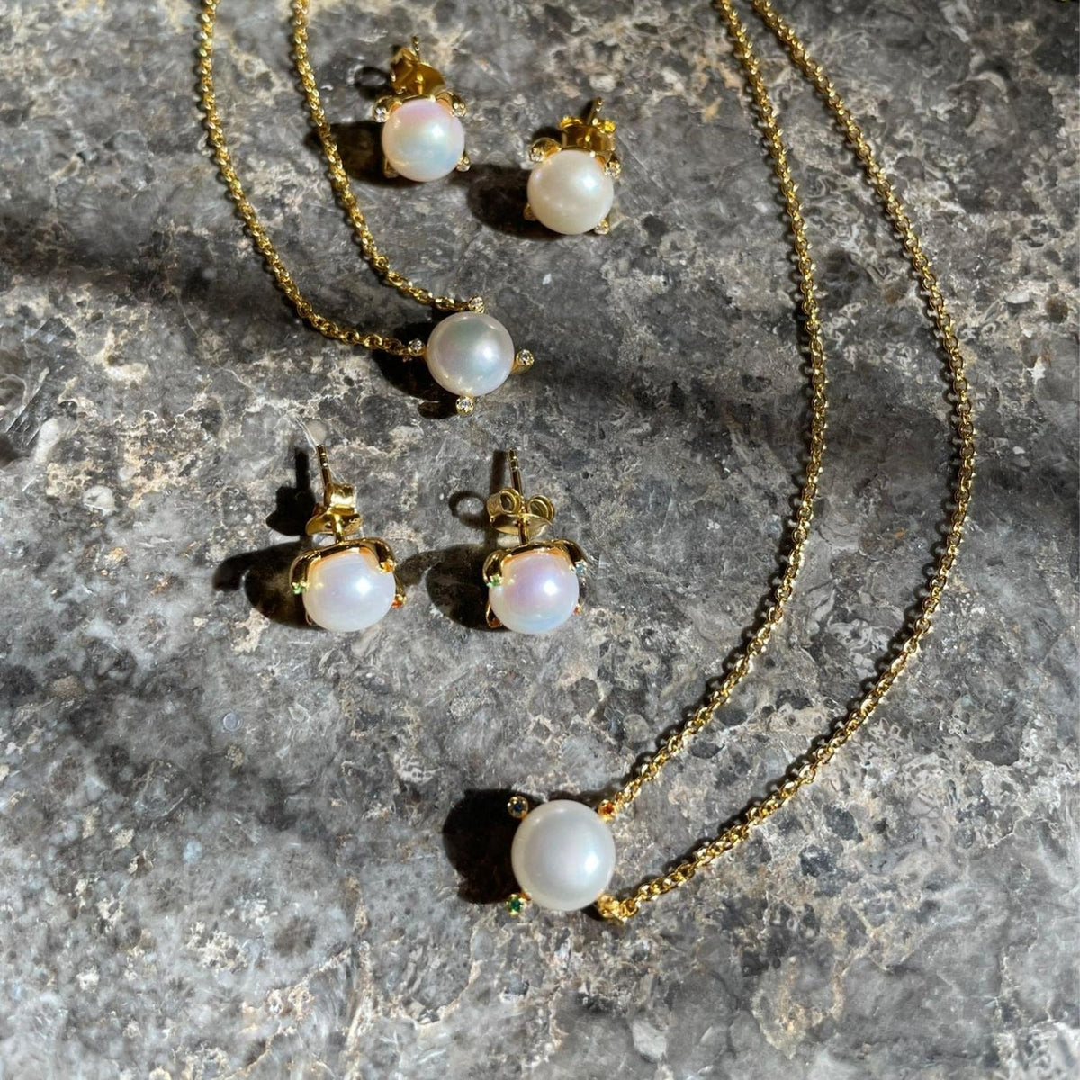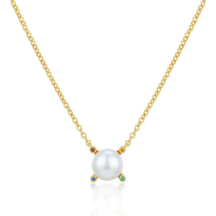 This necklace is made of 18k gold-plated sterling silver. It features an 8mm freshwater pearl and turquoise and pink zircons.