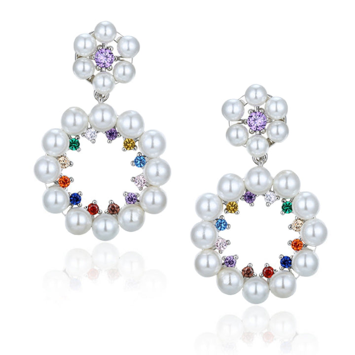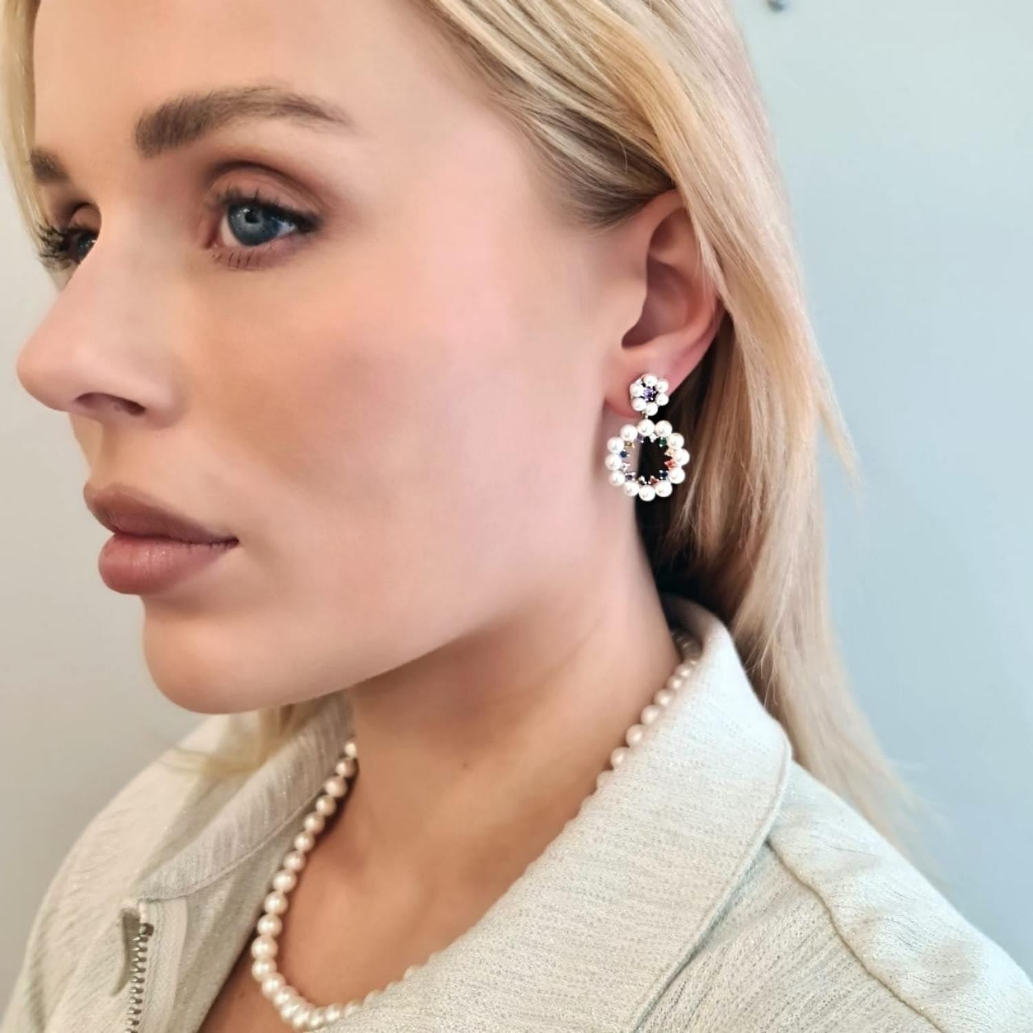 The Ginevra Earrings by House of Elliott are detailed and stylish, perfect for a festive look. They are made of 925 sterling silver and feature high-quality seashell pearls and colorful zirconia. These earrings are a beautiful blend of elegance and sparkle, adding a vibrant and sophisticated touch to any outfit.