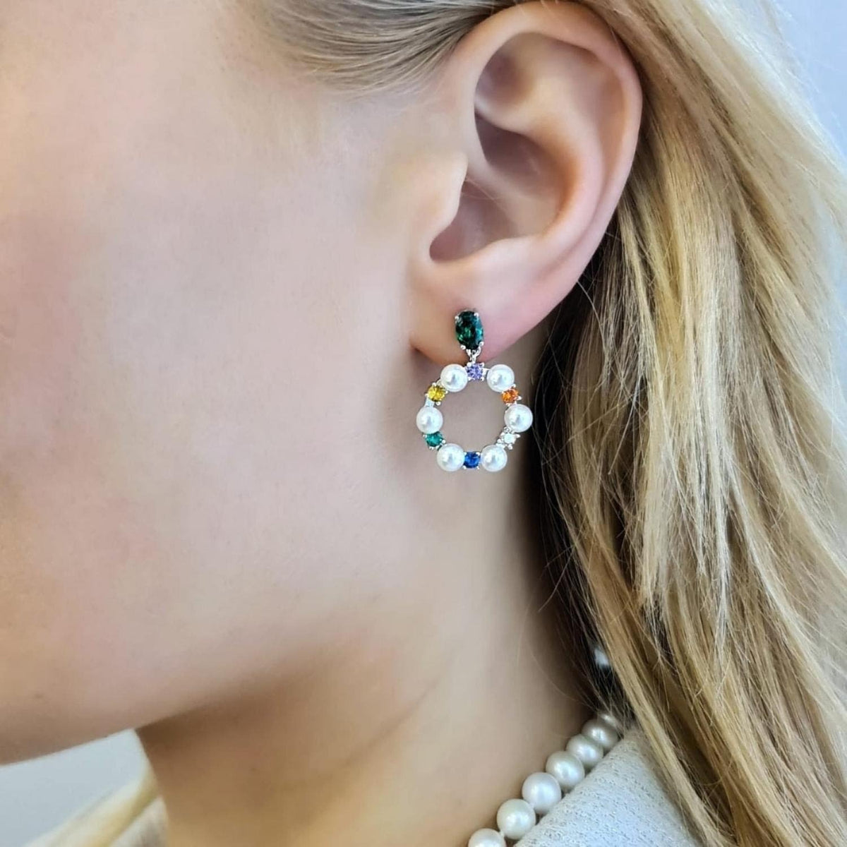 These dangle earrings are made of 925 sterling silver and feature 4mm seashell pearls and multi-colored zirconia.