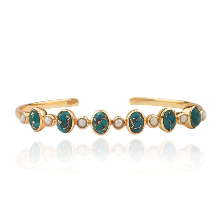 This bracelet is handcrafted from 18K gold-plated brass and is embellished with copper turquoise and pearls. It is nickel, lead, and cadmium-free.