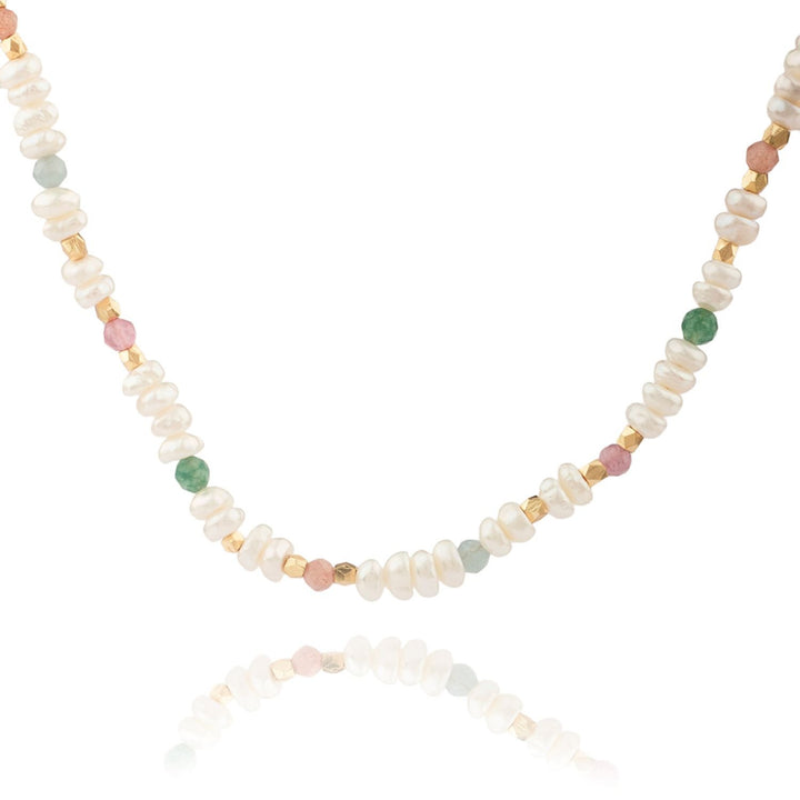 This necklace is made of 18K gold plated brass. It features semi-precious stones including rose quartz, aqua hydro, and rainbow stones, as well as gilded nuggets and natural pearls. The length is adjustable from 40-45 cm.