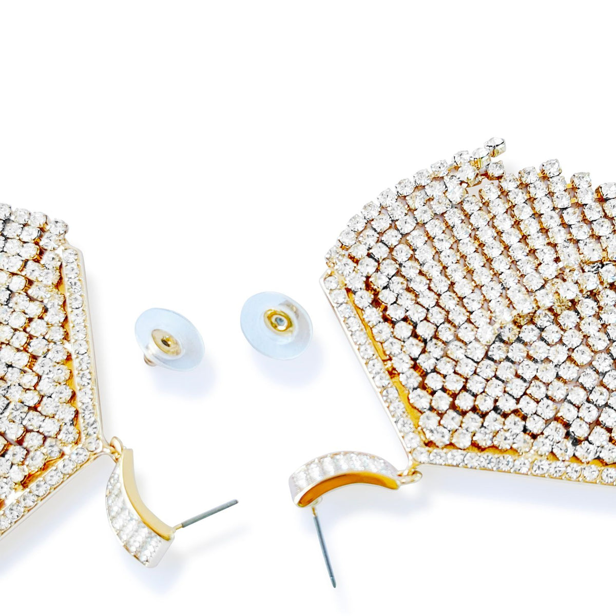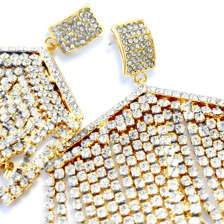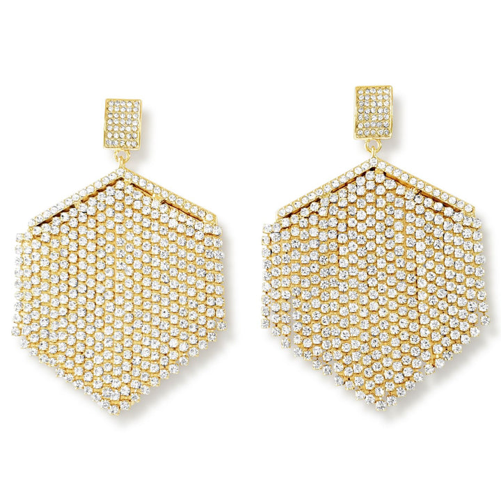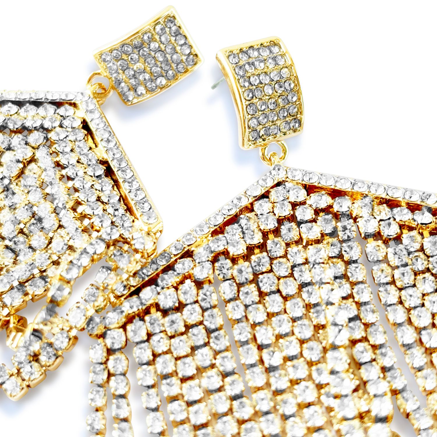 These dangle earrings are crafted with crystals. No metal is explicitly mentioned. The product title and description mention "crystal embellished" and "frill" details.