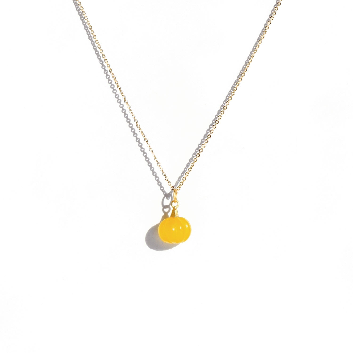 This Jade Pumpkin Pendant Necklace by I'mmany London is a limited edition piece that is ready to cheer up your earthy-toned outfits. The necklace features a hand-carved yellow jade pumpkin charm that hangs from a fine golden diamond-cut trace chain. It's a playful and unique accessory with a touch of natural charm.