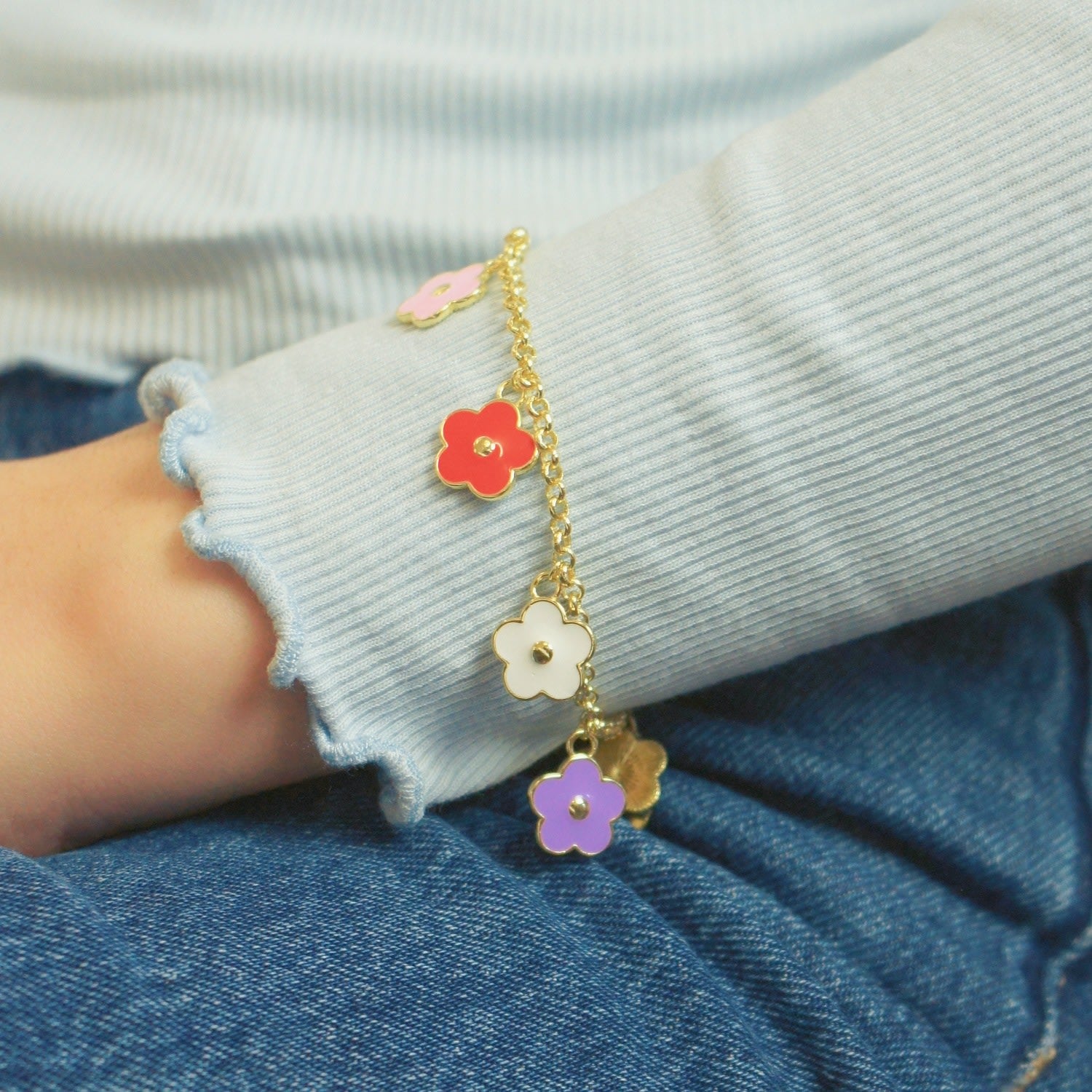This bracelet is crafted from 18k gold-plated brass and features six hand-painted enamel flower charms.