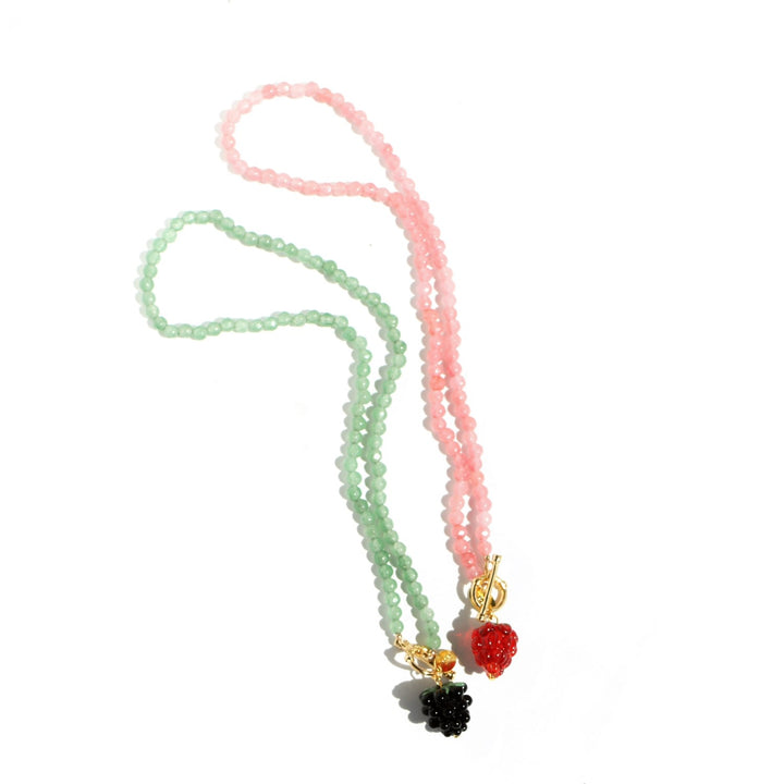 This Very Berry Gemstone Choker Necklace With Lampwork Glass Blackberry Pendant by I'mmany London is a refreshing and playful accessory. This fruity necklace features a cute handmade glass blackberry on a faceted gemstone strand. It is a perfect addition to your summer outfit.