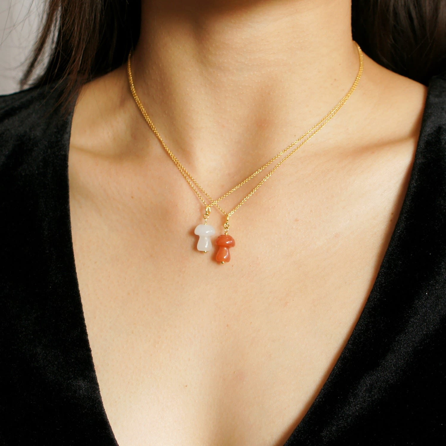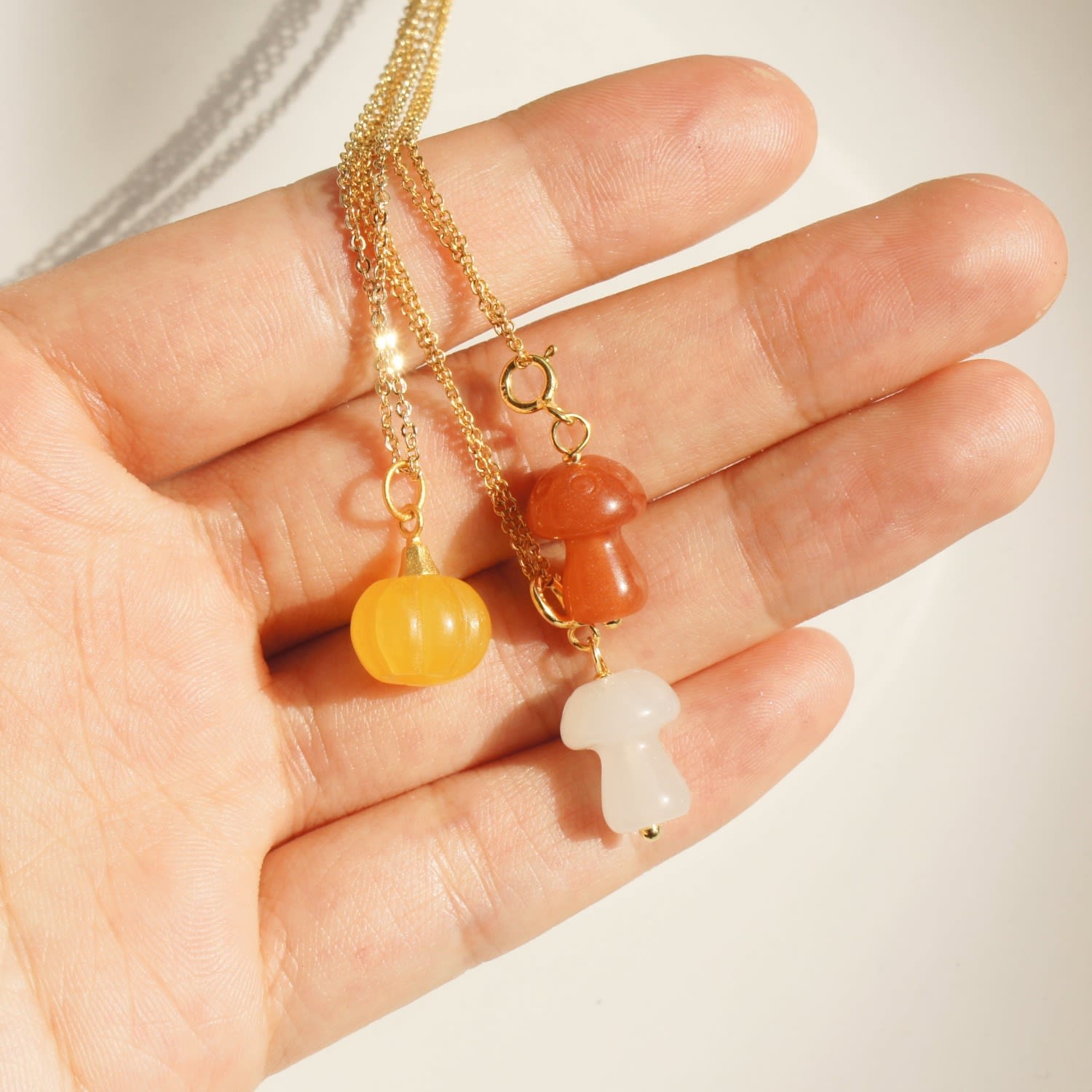 This Jade Mushroom Pendant Necklace - White by I'mmany London is a special accessory. It features a hand-carved natural jade mushroom pendant dangling from a fine golden diamond-cut trace chain. Each piece is unique and comes in limited stock.