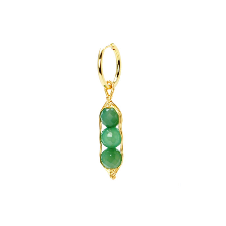 This Garden Peas Single Earring Green Chrysoprase by I'mmany London is a playful and whimsical accessory inspired by the sweet sugar snap peas from a grandmother's garden. This handcrafted single earring features faceted green chrysoprase beads dangling from a gold vermeil hoop, bringing a unique and charming touch to your style.